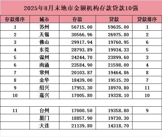 2025年8月末金融存款额十强地级市出炉:苏州位居第一名、南通不敌温州 金融存款