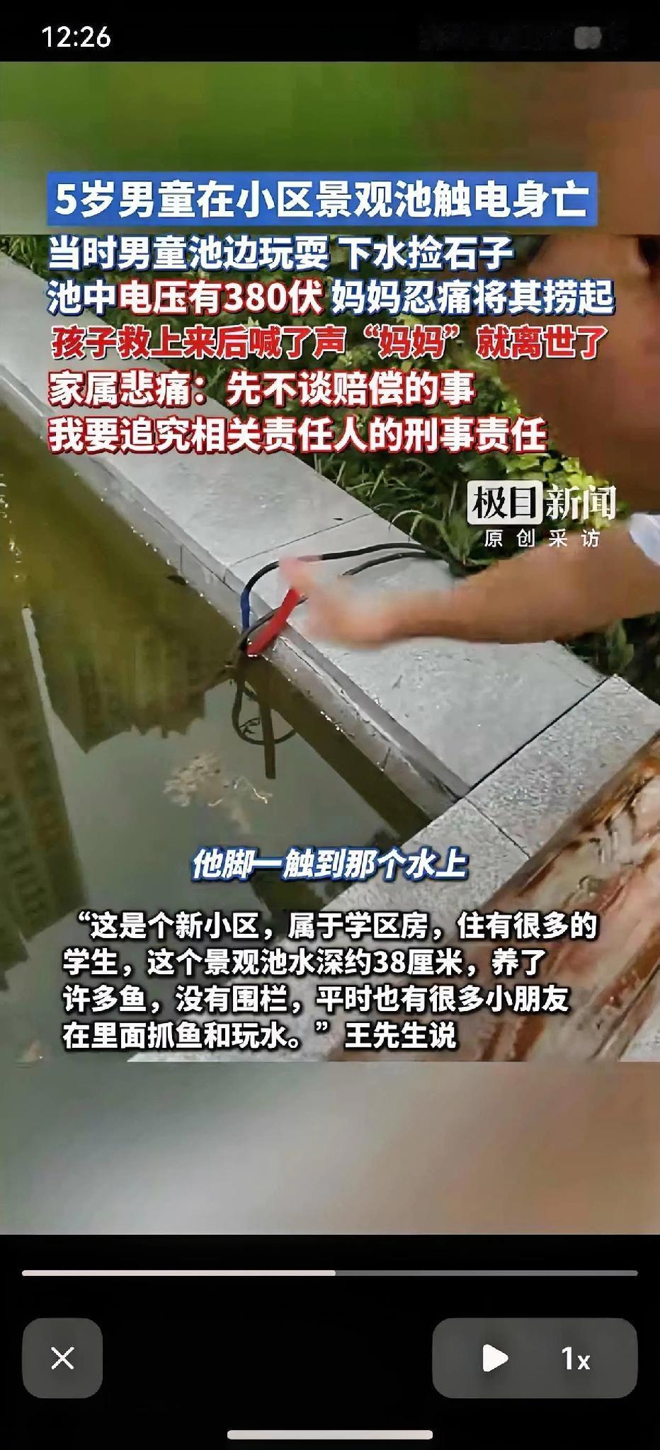 5岁男童在小区景观池触电身亡。 网友给出建议:“水中有灯的地方,尽量不要下水。”
