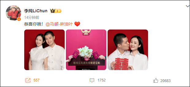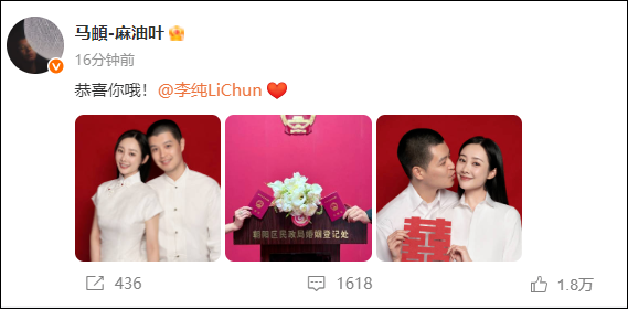 10月2日,李纯马頔官宣结婚,两人晒出红底照&领证现场照片,并互相喊话:“恭喜你哦!”