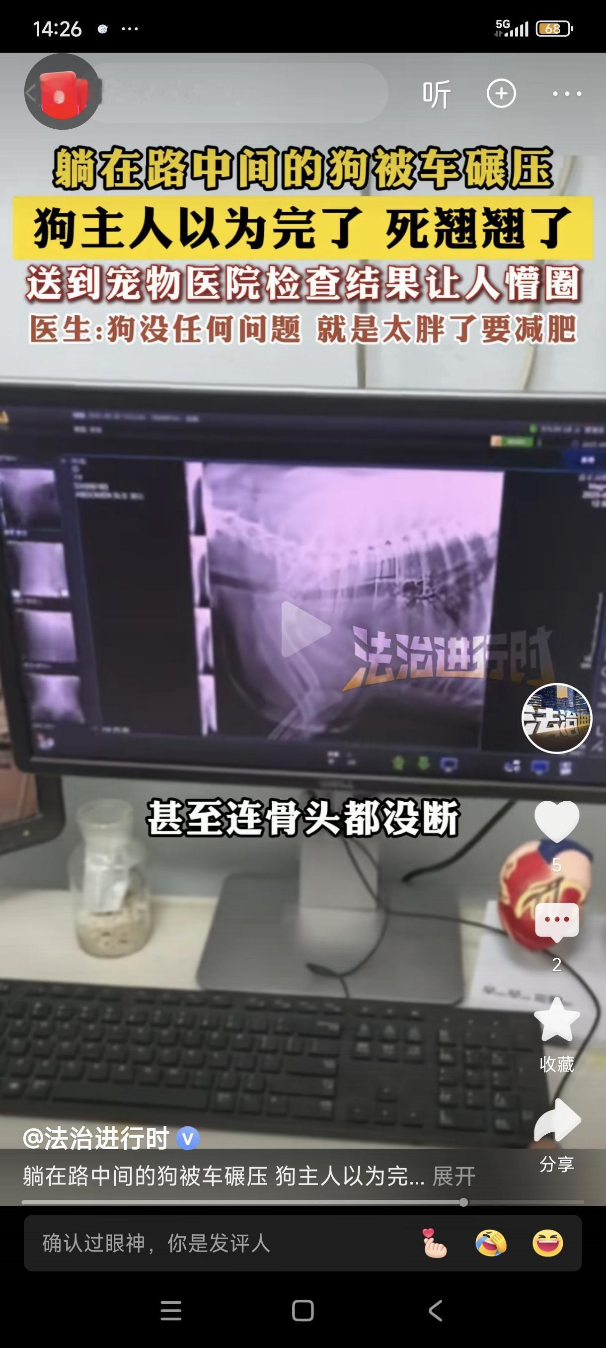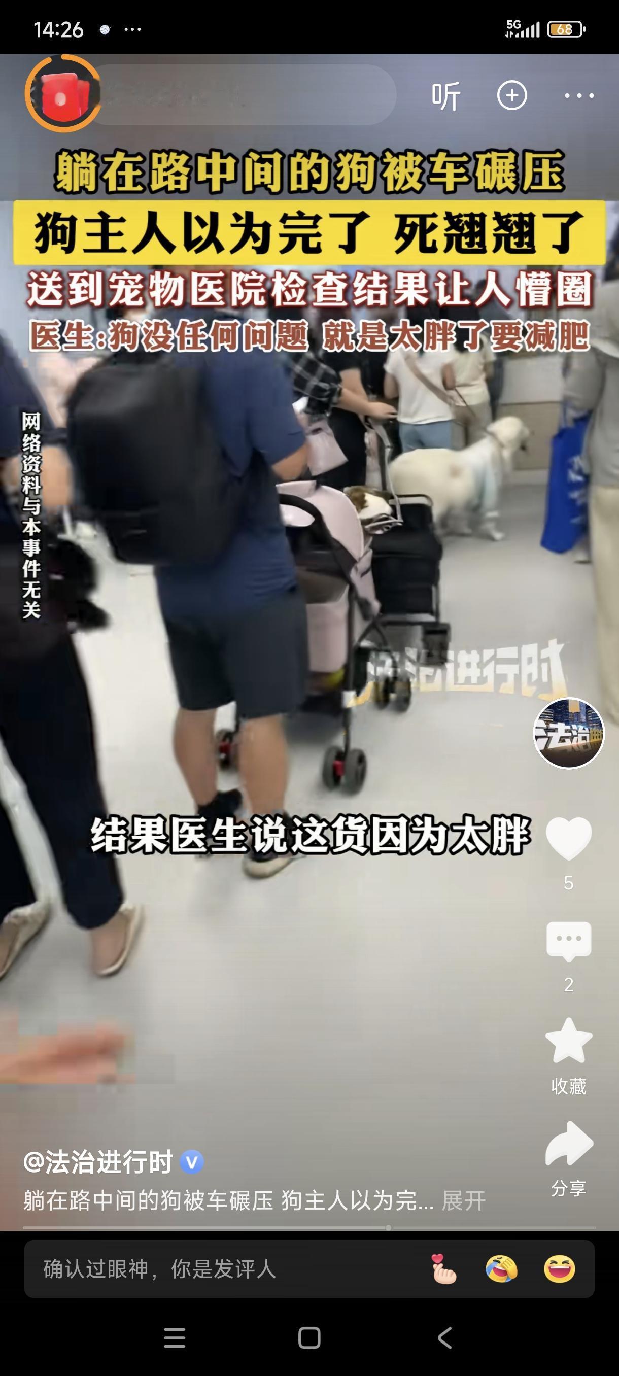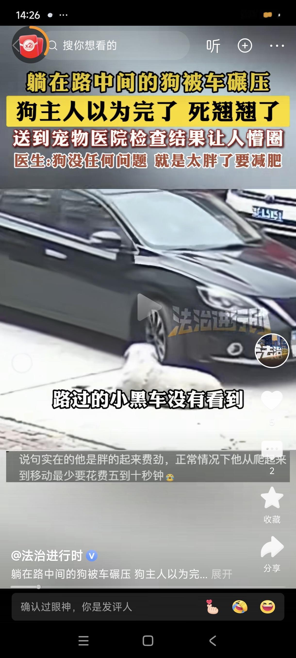 “胖还能救命?”近日,山东发生了件不可思议的事!一条白色的狗躺在路中间,黑色轿车的车主人没看到,直接碾压了过去。可是,让人没想到的是,等这狗被解救出来,狗的主人带它去看兽医时,医生竟跟他说,狗没事,主要是太胖了,需要瘦身! 医生这话让狗的主人都懵了!不过,同时又很庆幸,毕竟被压了半个身子,还能够好好的,真的是很难得! 不得不说,狗的这身肉长得太好了!关键时还能救命! 你怎么看? 信息来源:法治进行时。狗躺在路中间被碾压,医生:狗没事,主要的问题是胖——