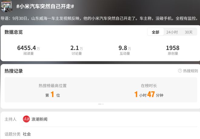 电动知家消息,9月30日,山东威海一则监控视频将小米汽车再次推上风口浪尖。一名车主发布视频称,其停放于店门口的小米汽车在无人操作的情况下突然自动启动并驶离现场,全程未触碰手机钥匙,车内无人驾驶。相关话题迅速引爆社交媒体,阅读量突破6500万,一度登顶微博热搜榜首。