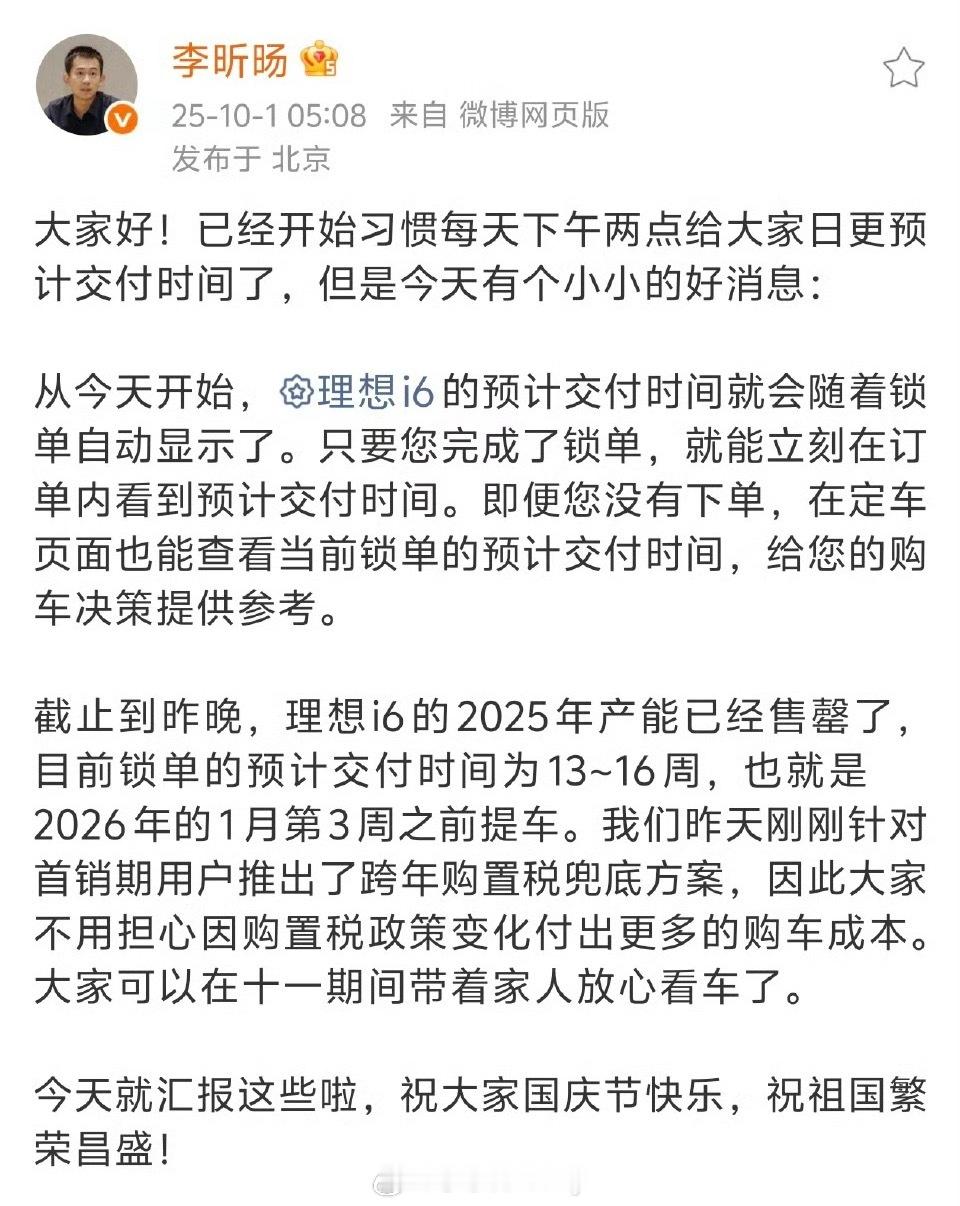 理想i6关于产销最新消息