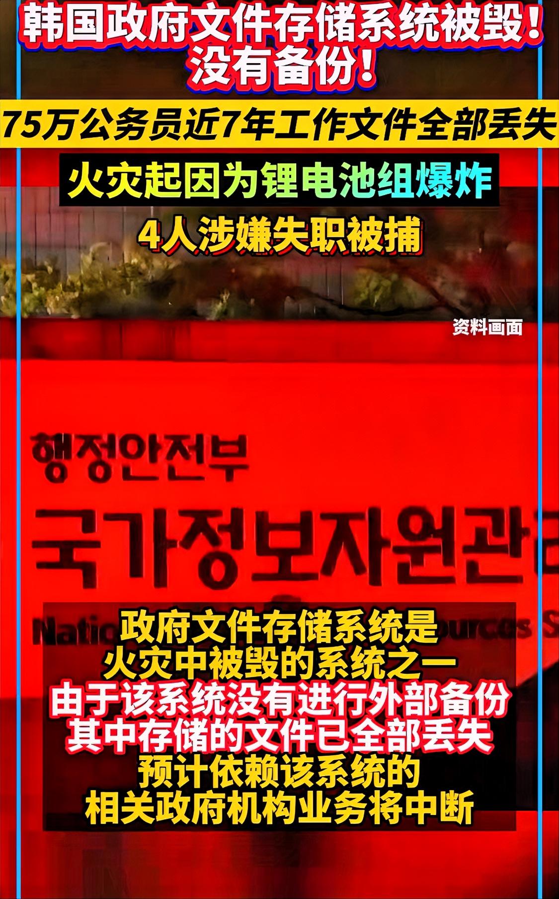 是自信还是疏忽,一国政府重要文件储存系统竟然没有外部备份…… 9月26日晚,韩国国家计算机网络中枢——位于大田的国家信息资源管理院的机房因锂电池组爆炸起火,导致约75万名公务员近7年的工作文件全部丢失,且由于系统没有进行外部备份,数据无法恢复。另外还导致近三分之一(647 个政府业务系统停止运行,其中 96 个系统被毁)的在线信息服务和系统瘫痪,连国务总理办公室、行政安全部和财政部门等主要政府机构网站都因火灾无法访问。 在数字化时代,健全的数据备份和容灾机制不是可选功能,而是保障组织正常运行的必需品。令人惊讶的是,早在2023年韩国就曾发生过类似的政府服务宕机事件,韩国政府却至今没有建立啥有效备份机制,实在是多少让人意想不到……