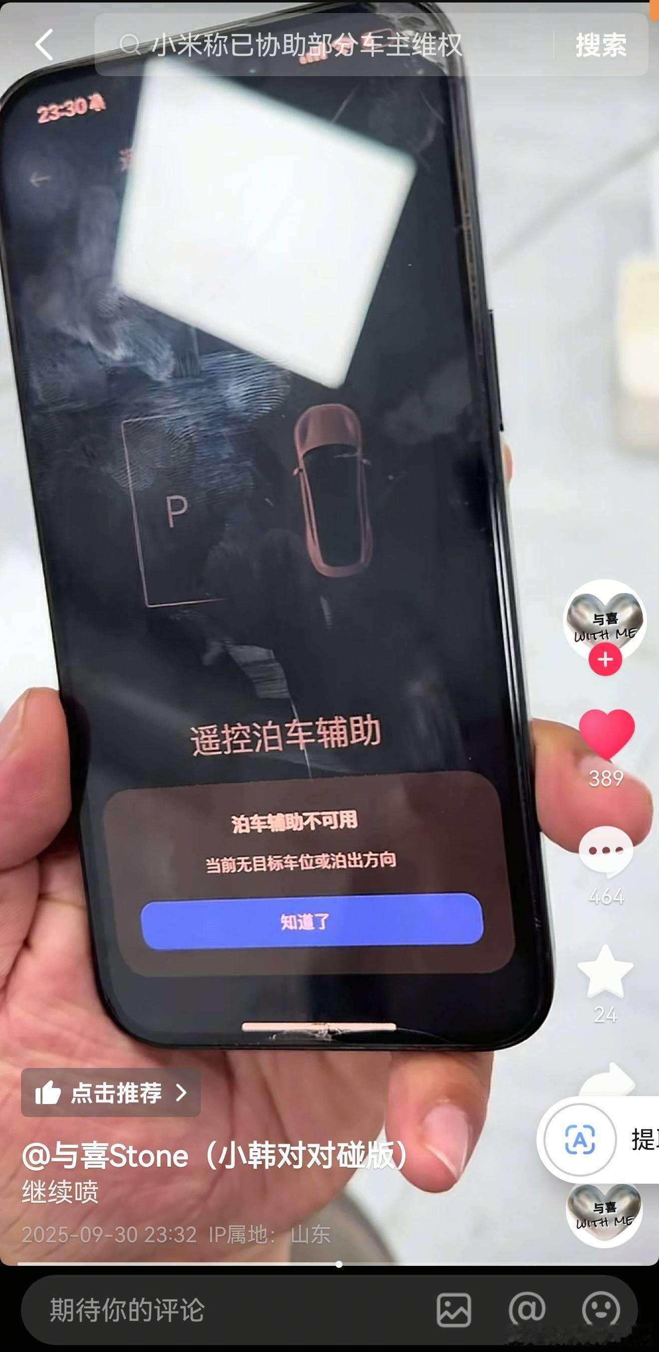 有博主表示,小米官方说是另外一台手机操作的,但是车主似乎并不认可这一说法,车主还表示停车位置泊车辅助功能是不可用状态,你们觉得谁说的可信度更高?
