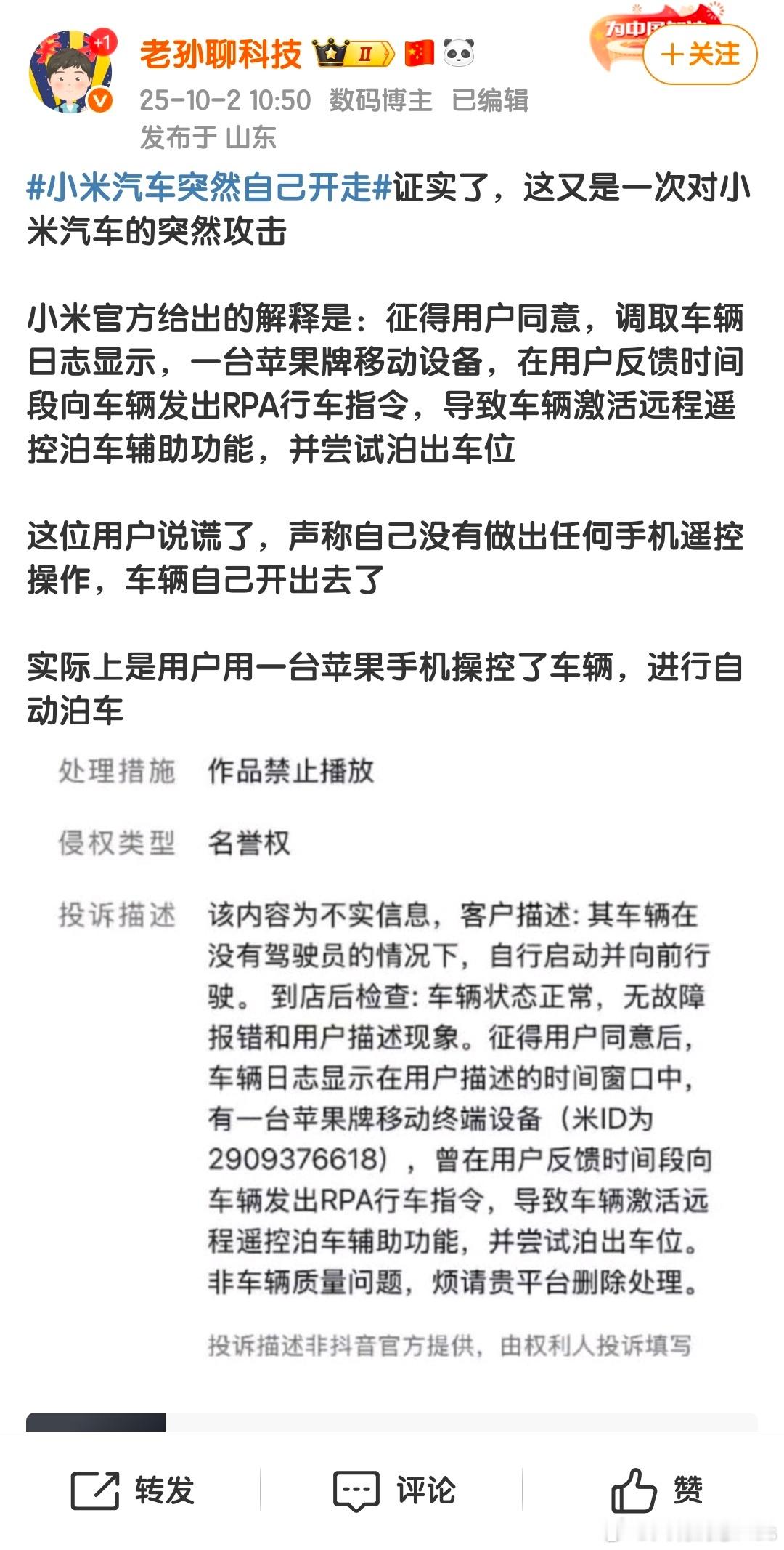 有博主表示,小米官方说是另外一台手机操作的,但是车主似乎并不认可这一说法,车主还