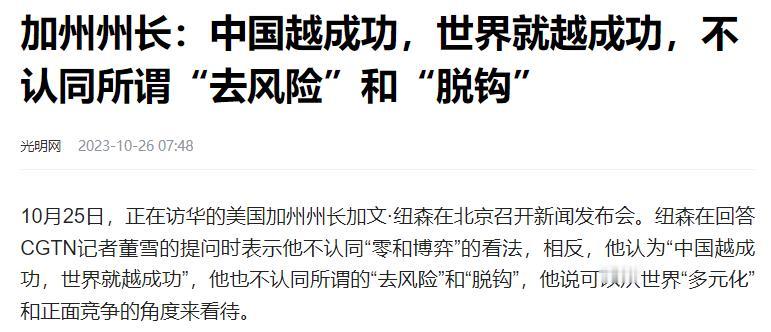 加州州长的一句话震动全球!纽森在2023年10月曾直言“不要眼红中国的成功!中国越强大,世界就越繁荣!不要嫉妒中国的成就,因为只有不眼红,才会让全球更辉煌!” 这番打破西方舆论偏见的话,放在2025年更具现实意义,道出了全球发展核心逻辑:各国相互依存,一国进步从不是你赢我输的零和游戏,而是带动大家共好的引擎。 从经济看,中国对全球增长的拉动获国际认可。国际货币基金组织2025年1月预测,中国经济今年增长4.6%,过去十二年对世界经济增长平均贡献率超30%,连续多年是全球增长最大动力源。 贡献不仅在规模,质量提升也很明显。2024年中美贸易活跃,中国出口的机电产品、日用品满足美国消费者需求,美国农产品、高科技产品也借中国市场获更多机会,双方形成互补共赢的贸易循环。 中国发展红利还通过全球合作惠及多国。截至2025年9月,全球发展倡议有130多个国家和国际组织参与,4年动员230多亿美元资金开展1800多个项目。 东南亚基建、非洲农业帮扶、欧洲清洁能源、拉美数字建设等领域,中国都秉持共商共建共享原则,将自身经验转化为各国共享机遇。世行研究显示,这类项目能让参与国贸易成本降1.1%至2.2%,为全球增长拓新空间。 这种发展模式跳出“国强必霸”思维,中国连续多年居全球第二大进口市场,每年进口额高位运行,给各国企业提供广阔市场;应对气候变化上,中国建成全球最大新能源产业链,10年带动全球风电、光伏成本分别降超60%和80%,与100多国开展绿色能源合作,为《巴黎协定》实施提供支撑。 正如纽森所言,与其嫉妒我们不如找我们合作,中国各类国际倡议正是为解全球难题,推动构建人类命运共同体。 单边主义抬头的当下,纽森言论是清醒剂。全球经济如大船需各国共划桨,中国始终是负责任参与者。2025年中国持续扩大开放,推动高质量发展,计划未来5年在发展中国家新增2000个民生项目。 世界从中国发展中不仅获商机,更得合作共赢信心。这样的发展逻辑,正是全球繁荣最踏实的路径。