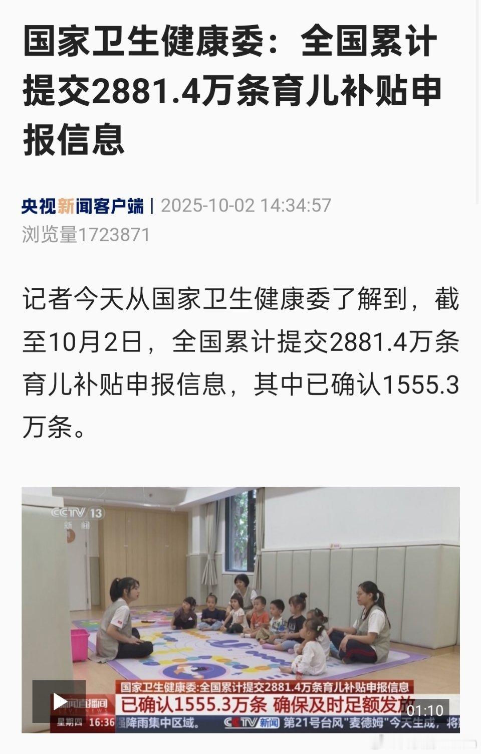 🔻国家卫生健康委:全国累计提交2881.4万条育儿补贴申报信息,其中已确认1555.3万条[哆啦A梦吃惊]