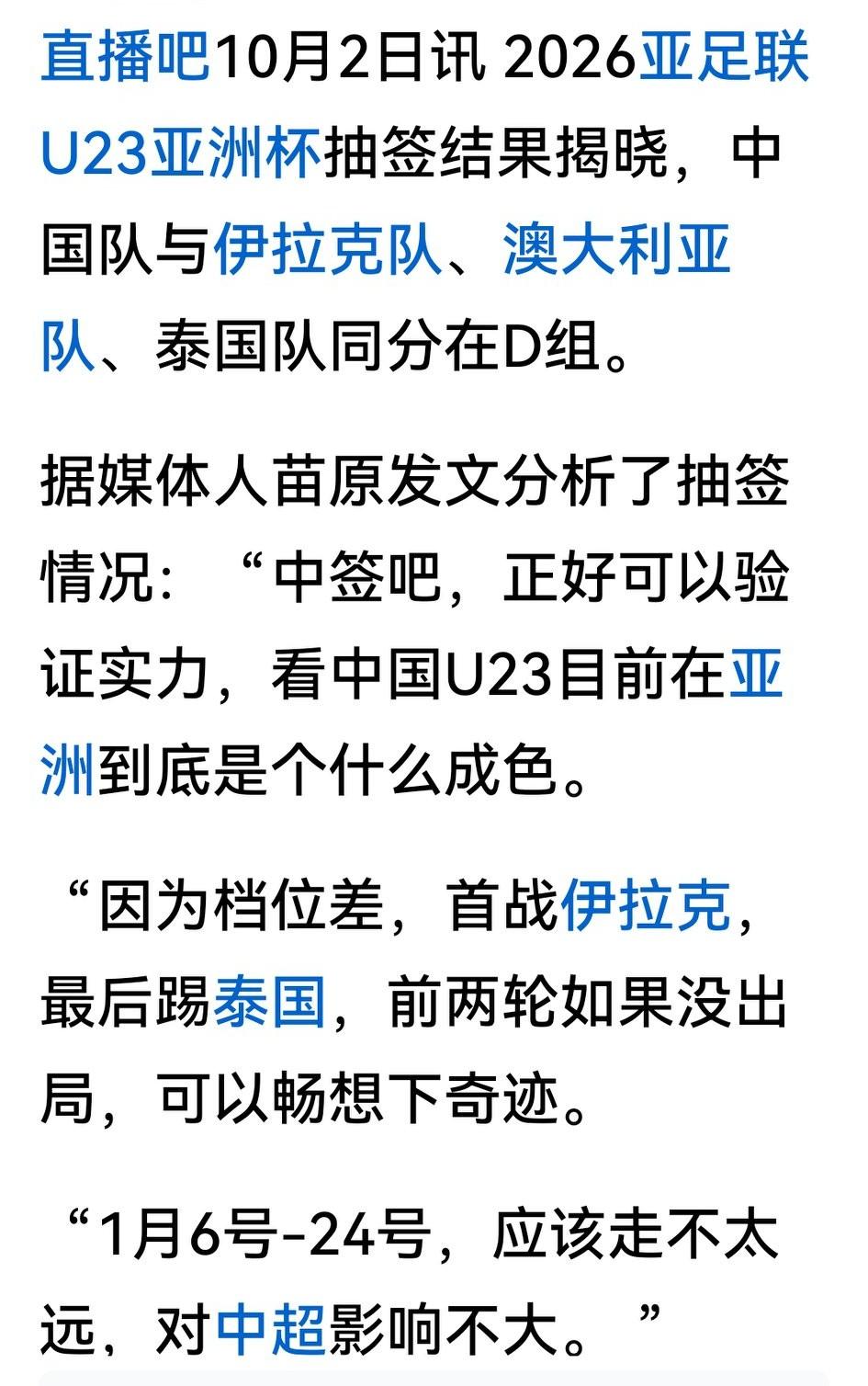 U23亚洲杯抽签结果出来后,有的说遭遇死亡之组,有的说是抽到上上签。其实把签运看得如此之重,我觉得都是不自信的表现。 先说知彼,足协曾请本组第一档次的伊拉克来过招,伊队却以手续不全为由怯战;在西安与第二档次的澳大利亚小组赛掰手腕,双方也是0:0携手出线;至于第三档次的泰国队,国足梯队历来胜多负少,估计也没太多麻烦。 再看知己,∪23锋线三中锋,显然要打长传冲吊、由高中锋做支点,再由王钰栋、蒯纪闻、李新翔等群起而攻之抢二三落点;再看防线,由3脚制服1.93M费利佩的刘浩帆队长领衔,谁敢在我们的后防称硬汉? 所以媒体和球迷先都自信一点,别给这支队伍加压力,任其放手一搏,即使偶有失手,但活力四射的U23定有奇迹,大概率能以小组第二成绩出线。