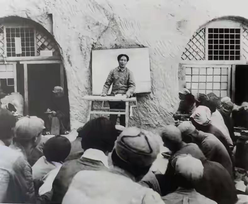 这个照片第一次刷到,一看就是刚去陕北,伟人还瘦瘦的,条件极其简陋,窑洞土墙面还不平整,窗户走风漏气,可能连门也没有,桌子更像个高凳,再看那个黑板放置方式,就地靠墙摆放。 尽管条件艰苦,学员们听的很认真,真是创业艰难百战多啊!