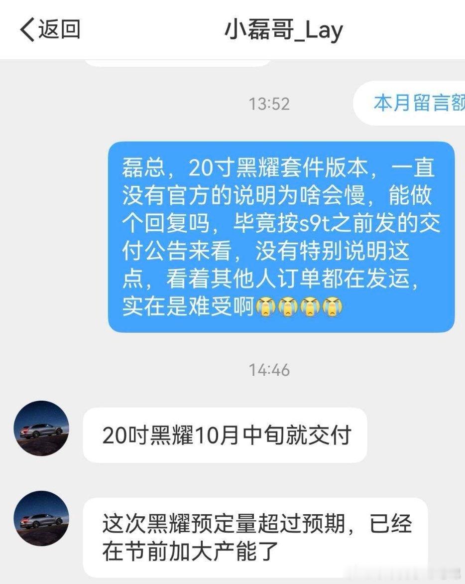 群里的S9T车主着急提车,私信了,这是少数不打太极的品牌高管,产品口的人就这样,