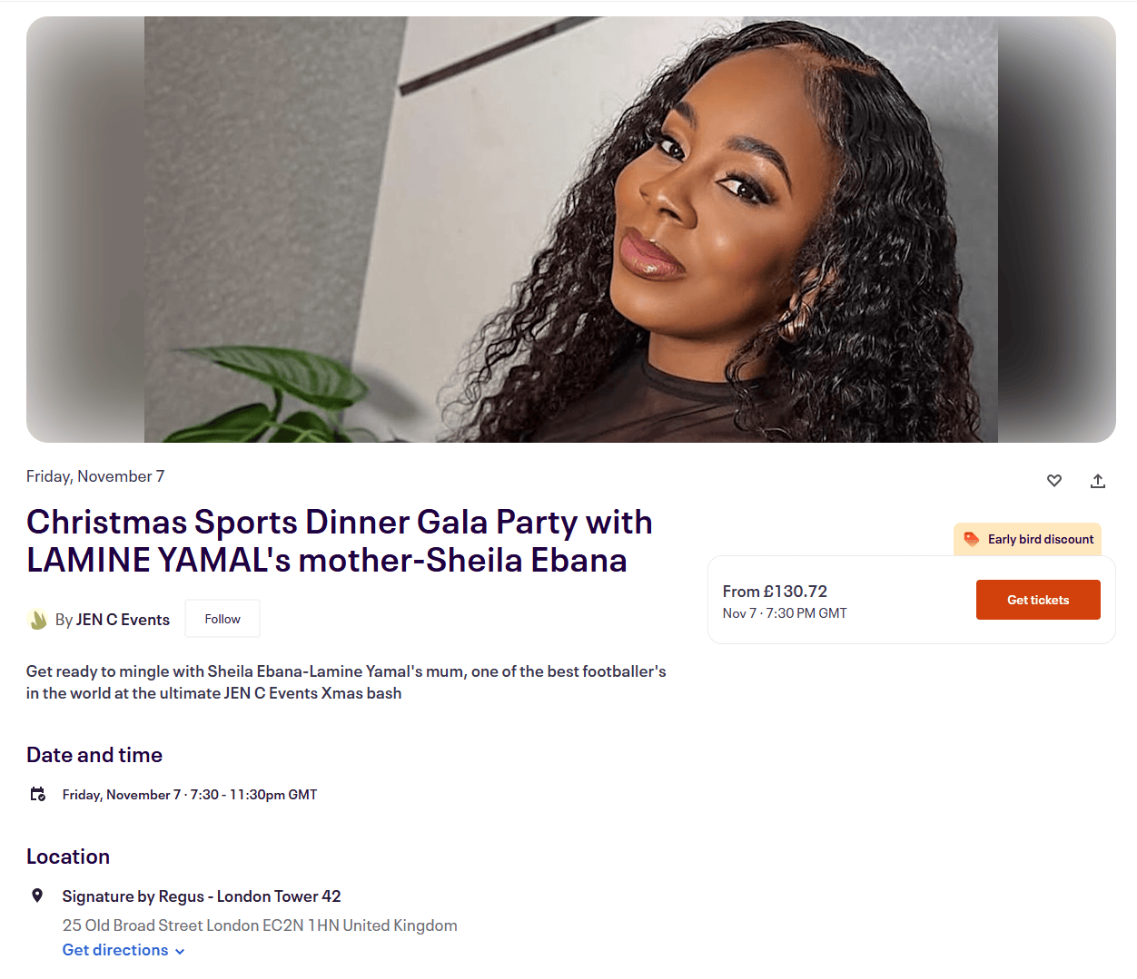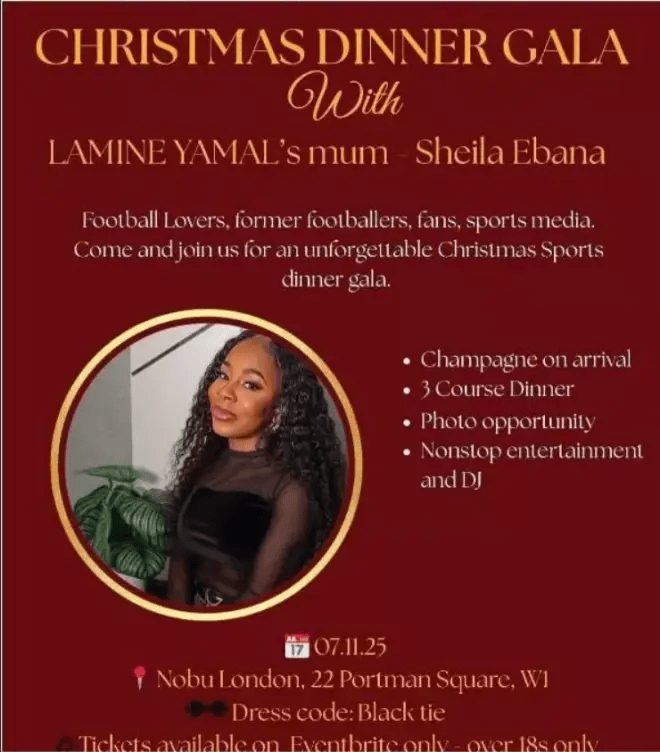 虎扑10月02日讯知名婚礼和活动策划公司JENCEvents宣布,亚马尔的母亲SheilaEbana将出席11月7日在伦敦举行的一场圣诞晚宴,而想要参加这场晚宴则要付最少130.72镑的门票价格。