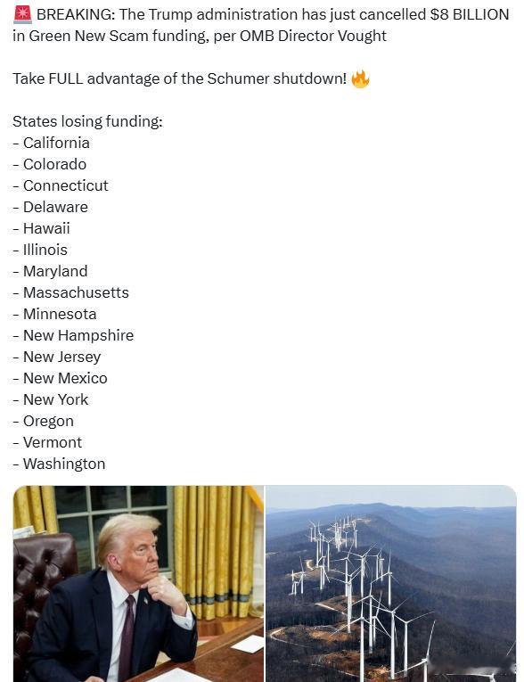 据白宫管理和预算办公室主任沃特表示,特朗普政府刚刚取消了80亿美元的“绿色新马扁局”资金。