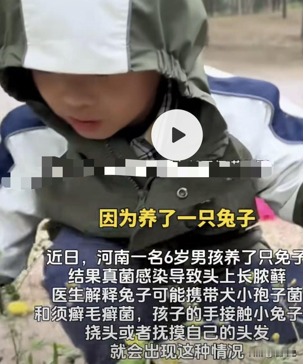 爱养兔子、小猫等小动物的注意了!医生郑重提醒了两点事项,需要牢记哦! 河南的6岁男孩养了只兔子,不注重卫生,经常性的直接用手抚摸头发,结果导致头上长脓廯,即使治好了,那块的头发以后也不会再长。 医生解释说,兔子可能携带犬小孢子菌和须廯毛廯菌,小孩子触碰到,再加上不注重卫生,很容易被传染到。 这男孩就是如此,最终只能留下疤痕性的脱发,很是可惜。 因此,医生强调,如果你要养小兔、小猫等小动物,需要特别注意这两点: 其一,触碰到了小动物一定要记得:及时洗手。 其二,家长日常要多观察小动物的体表有没有脓点等真菌感染的迹象,如有需要及时送往动物医院治疗。 记住了吗? 养小动物也须细心,不可粗心大意哦! 图源网络,侵删!