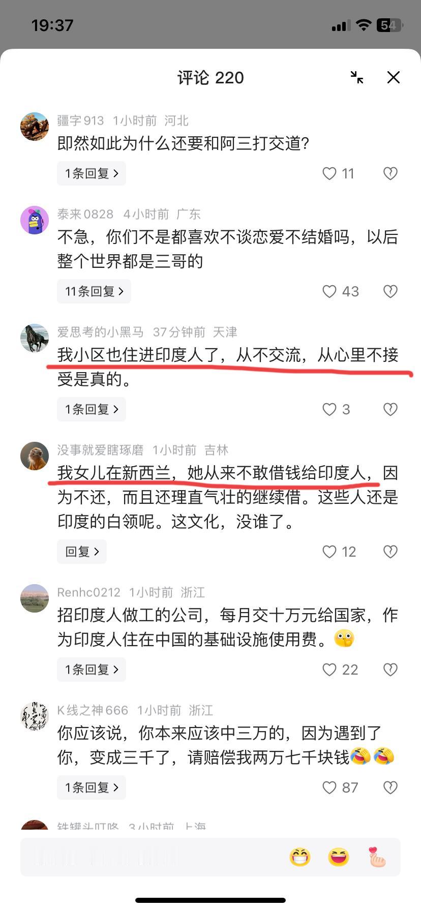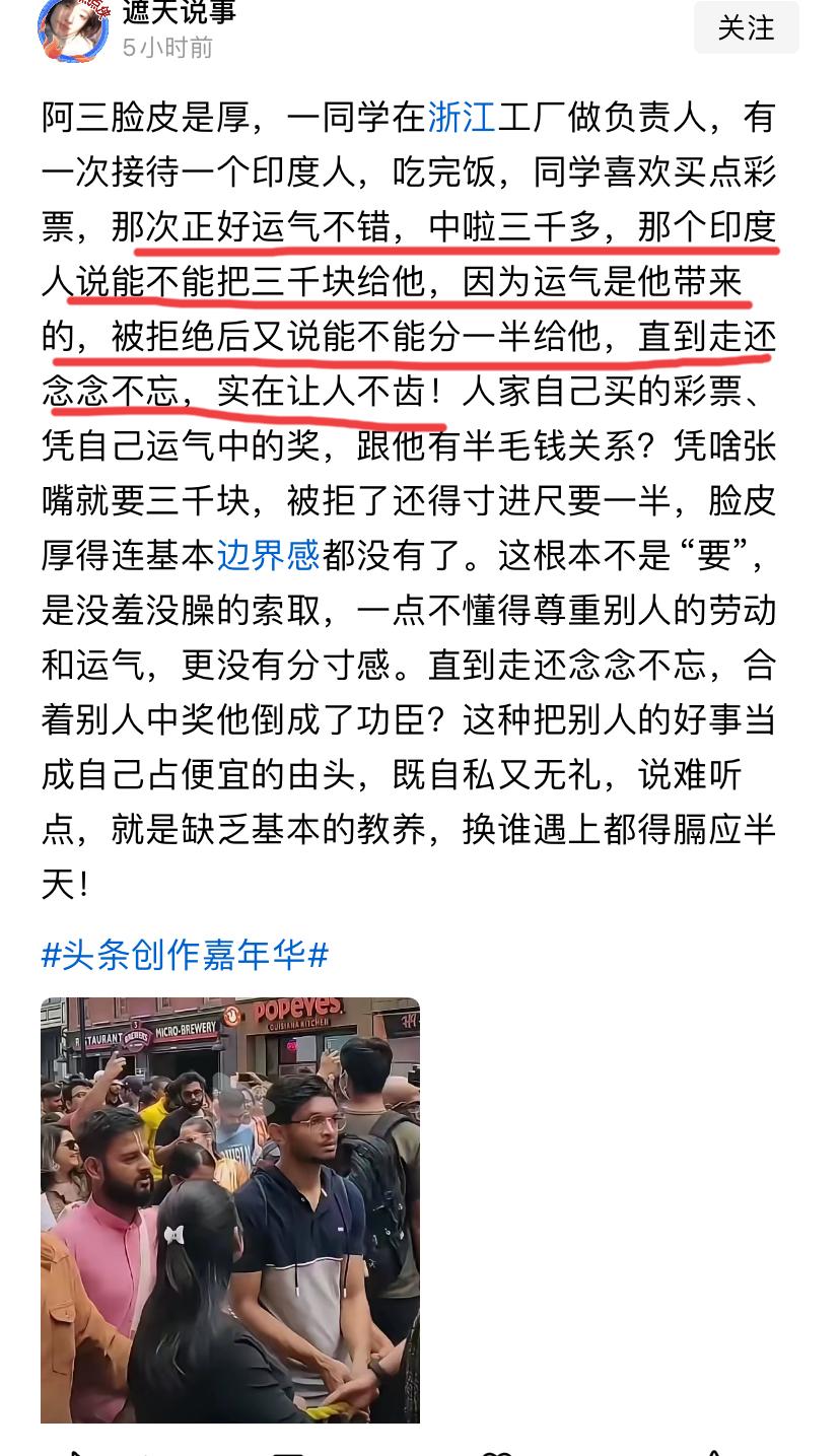 与一位阿三兄弟打交道真实感受,没有边界感!为什么巴铁兄弟很好打交道,近几年娶巴媳妇的越来越多,但是与阿三深交的国人真不多。 网友是一个工厂小头头,接待了一个印度人,他们吃了饭去买彩票,网友中奖了,阿三居然说沾了他的喜气,要分这个奖金。 另一位网友说,他小区住进一个印度人,从不交流。 还有一位网友说,女儿在新西兰,不敢借钱给印度人,他们不还仍要向你借。 你身边有印度人吗?