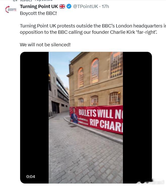 英国转折点在伦敦 BBC 总部外举行抗议,反对BBC称我们的创始人查理·柯克为“极右翼”。