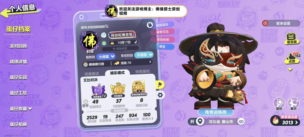 佛缘居士原创视频:Eggy Party 蛋仔派对 蛋仔派對 エギーパーティー 第26赛季国宝归乡季神奇艾比恭喜我大号荣登艾比对决-排位模式唐山市路北区第1名极电鸟荣登艾比排行榜唐山市第1名 制作时间:2025.10.02蛋仔派对 艾比