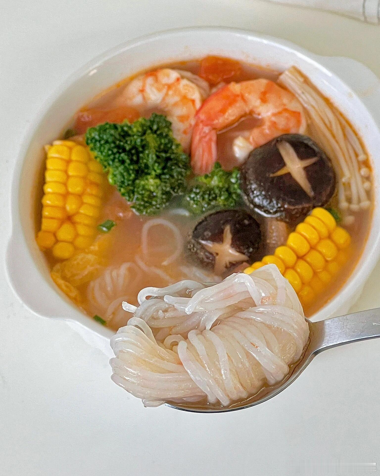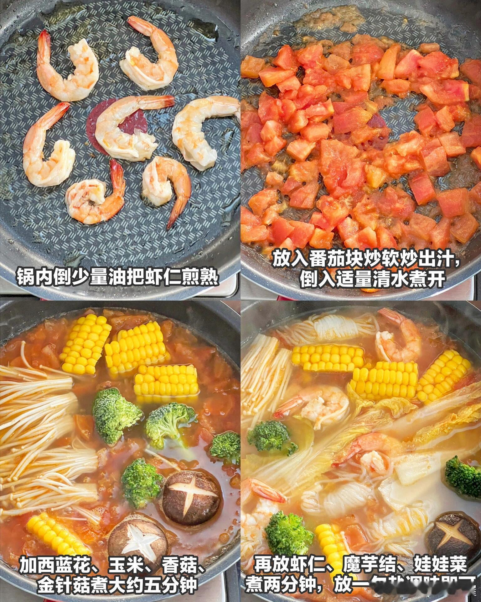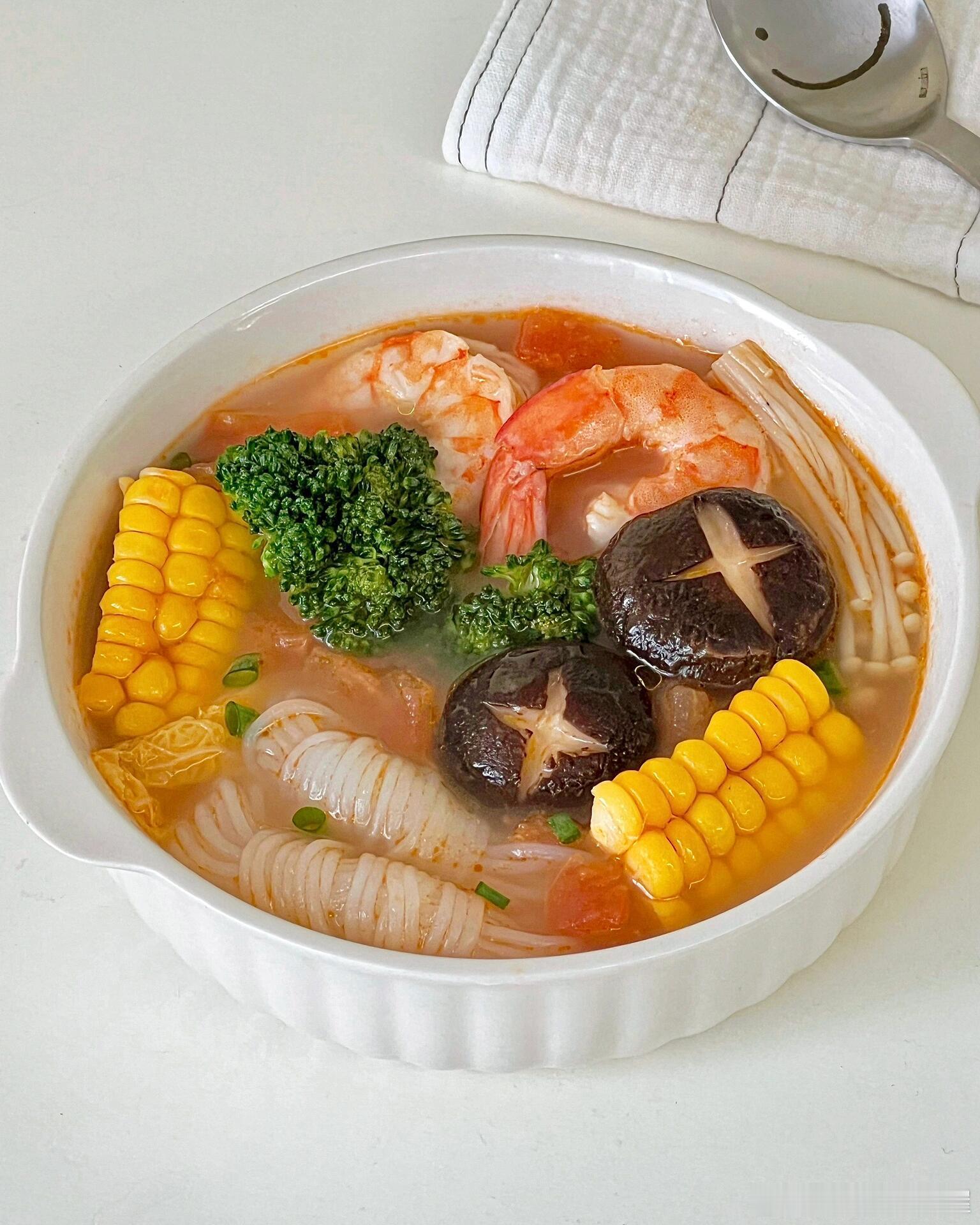 番茄、玉米、西蓝花、魔芋结、香菇、金针菇、虾、娃娃菜