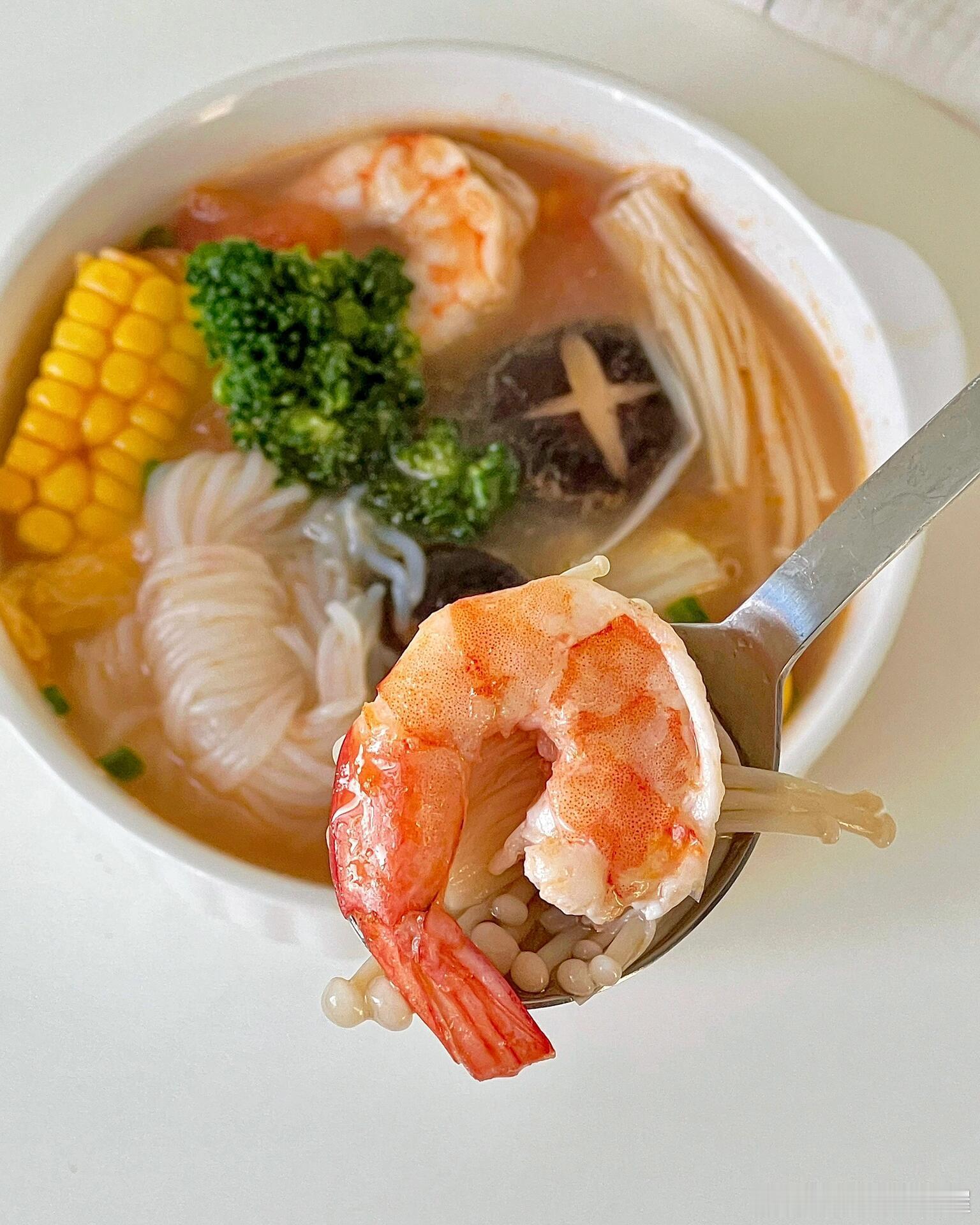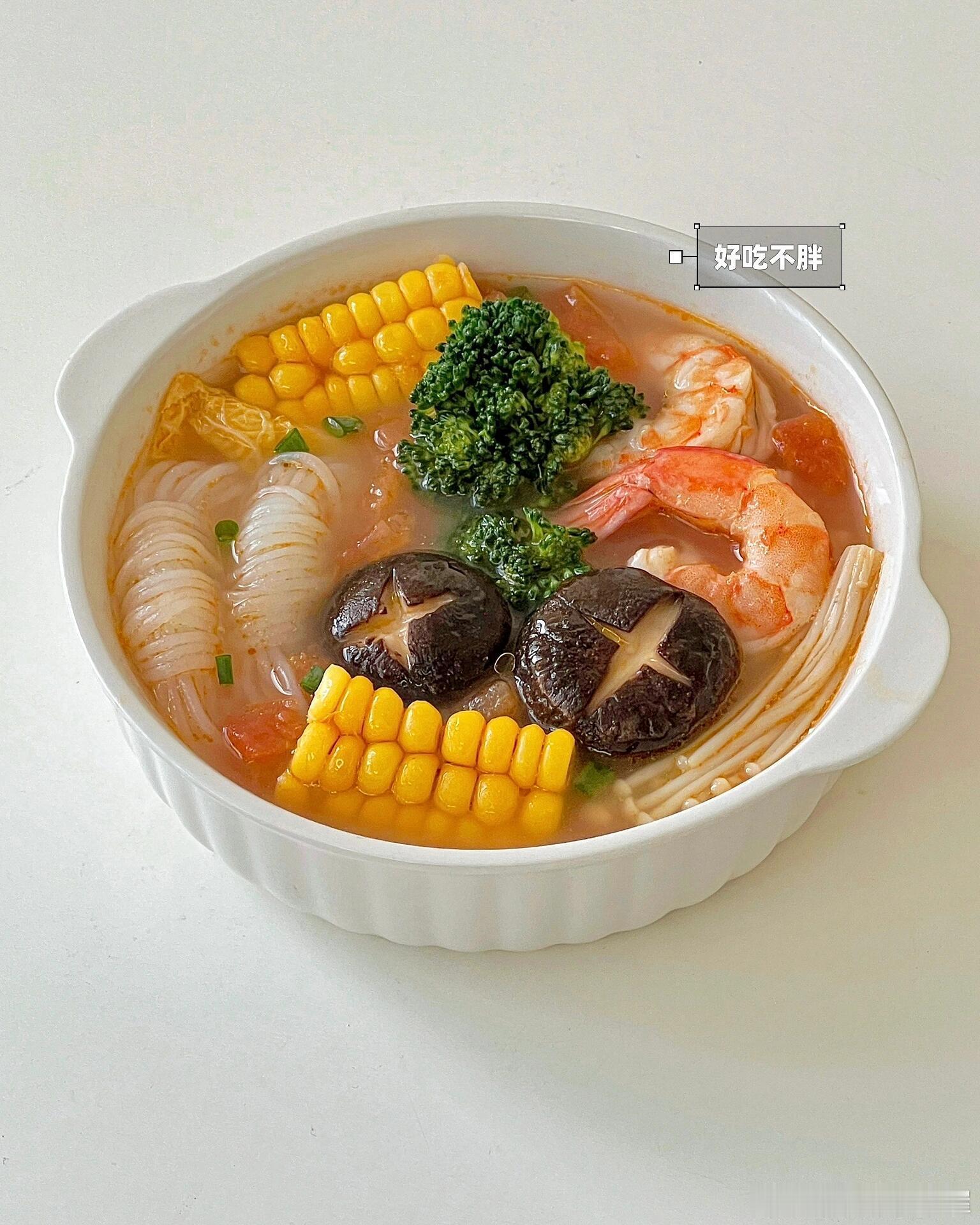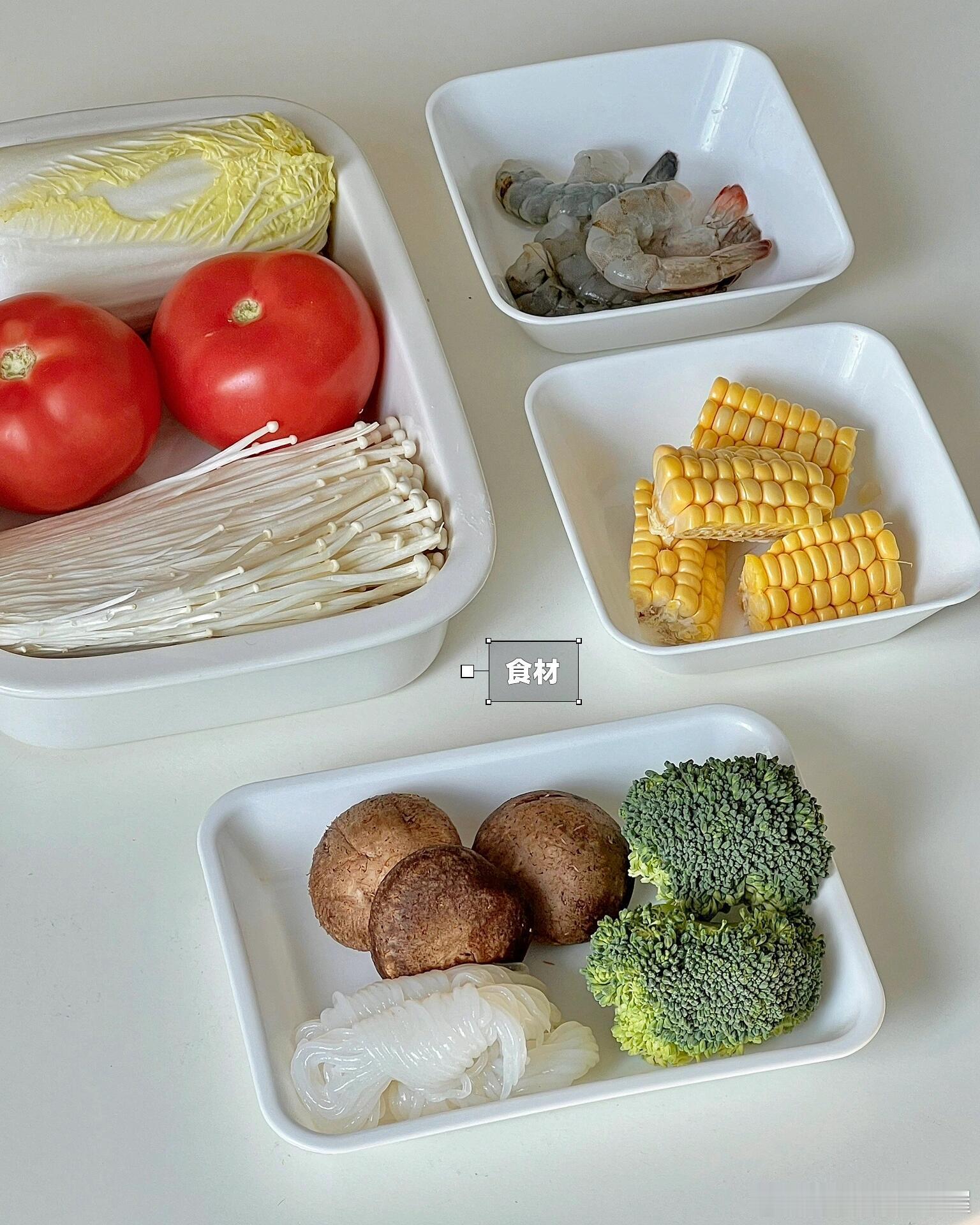 番茄、玉米、西蓝花、魔芋结、香菇、金针菇、虾、娃娃菜