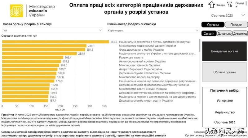 【哪个乌克兰部门高官薪酬最高】 乌克兰财政部的数据显示,国家预防腐败局负责人的月薪超过36.6万格里夫纳,是乌克兰国家机关管理者中最高的。 月薪排名第二的是国家团结部的高层官员,该部门作为独立机构成立还不到一年,就已被并入社会政策部,其负责人月薪为28.9万格里夫纳。 排名第三的是国有资产基金:该机构负责人的月薪接近28.5万格里夫纳。 教育和科学部、国家基础设施恢复与发展局以及国家证券和股票市场委员会的管理者薪资最低,月薪在15.8万至16.2万格里夫纳之间。 上述机构均为乌克兰国家层面的行政或监管机构,反映了乌克兰不同政府部门高层管理者的薪资差异。