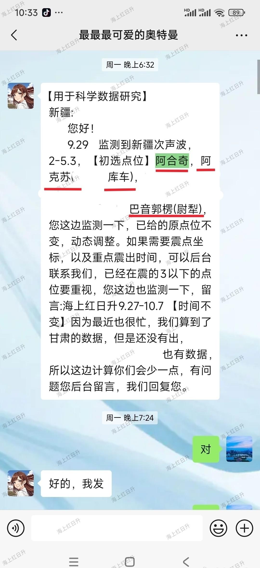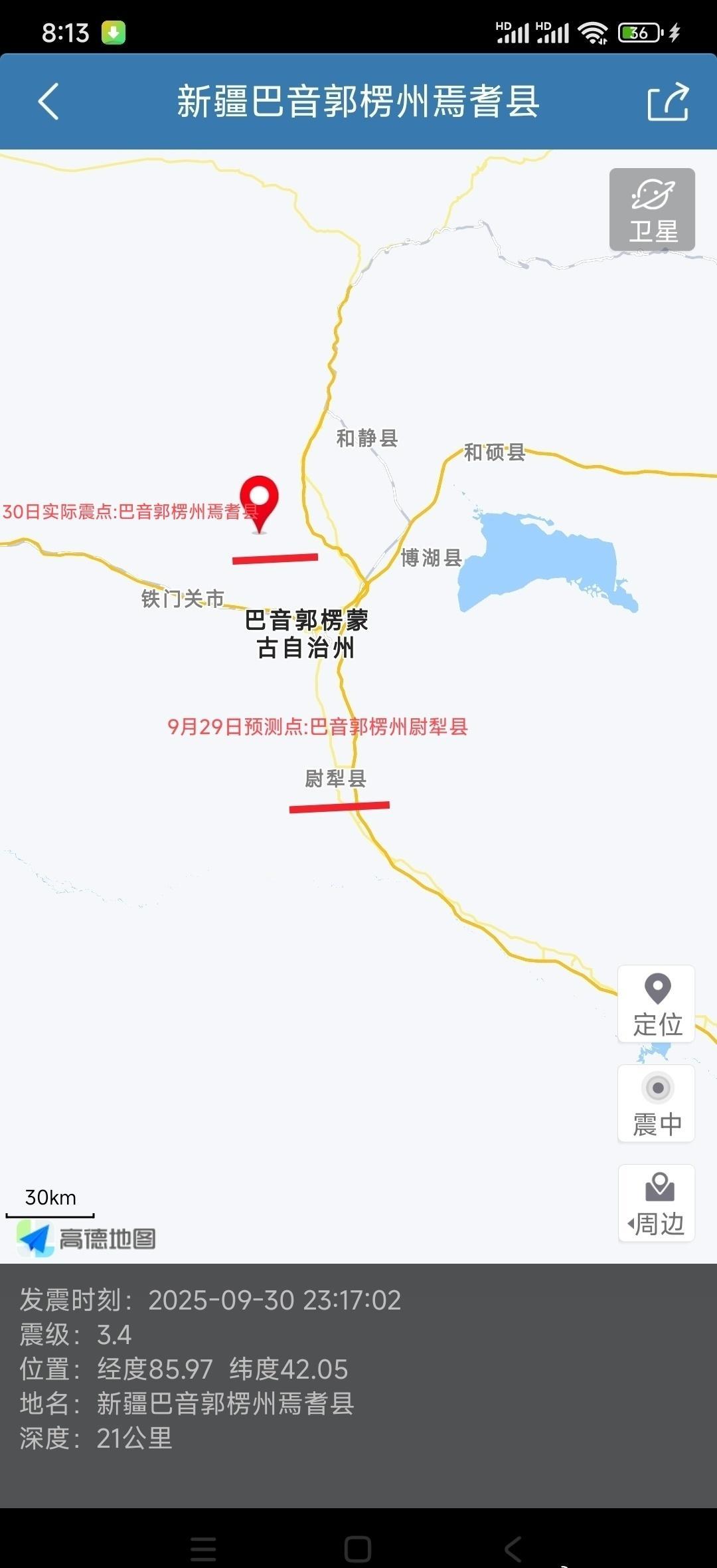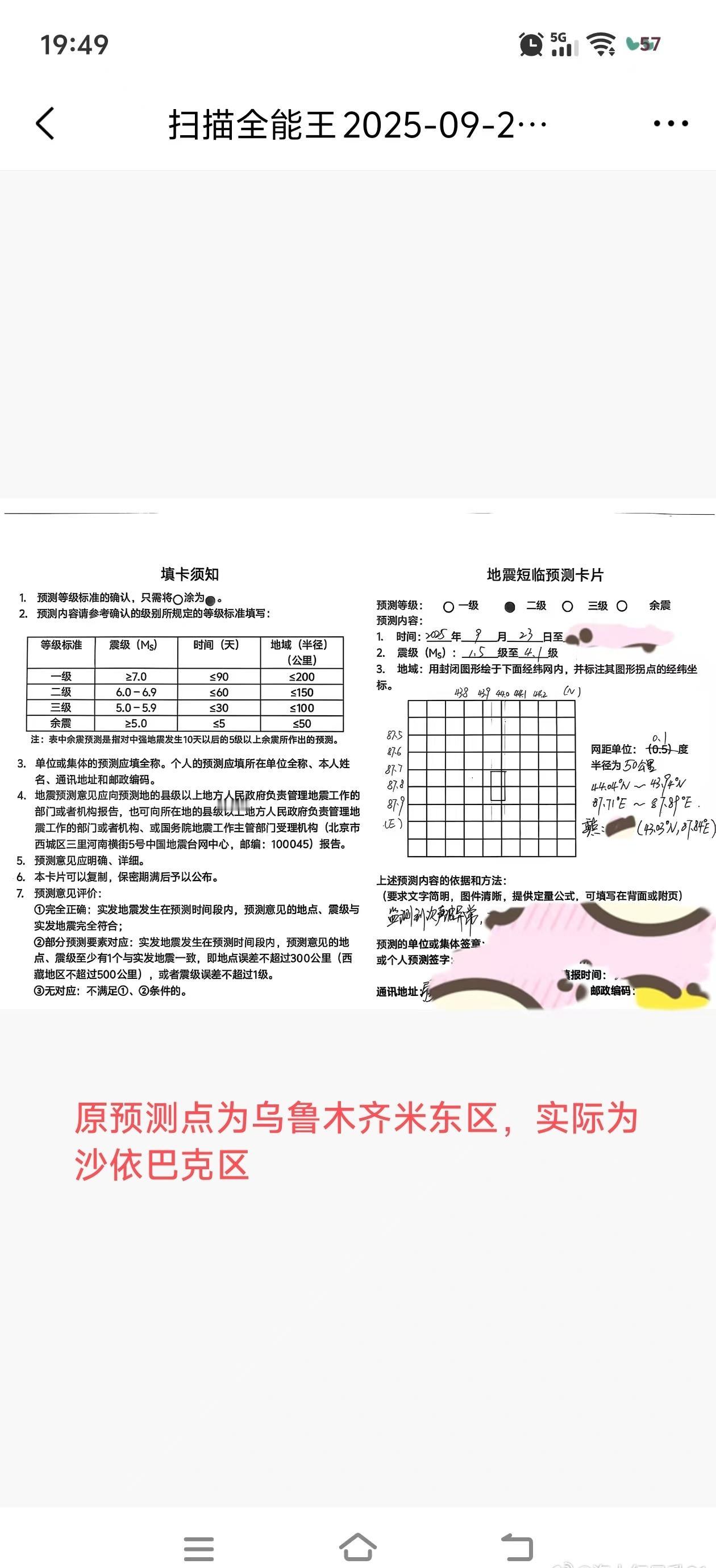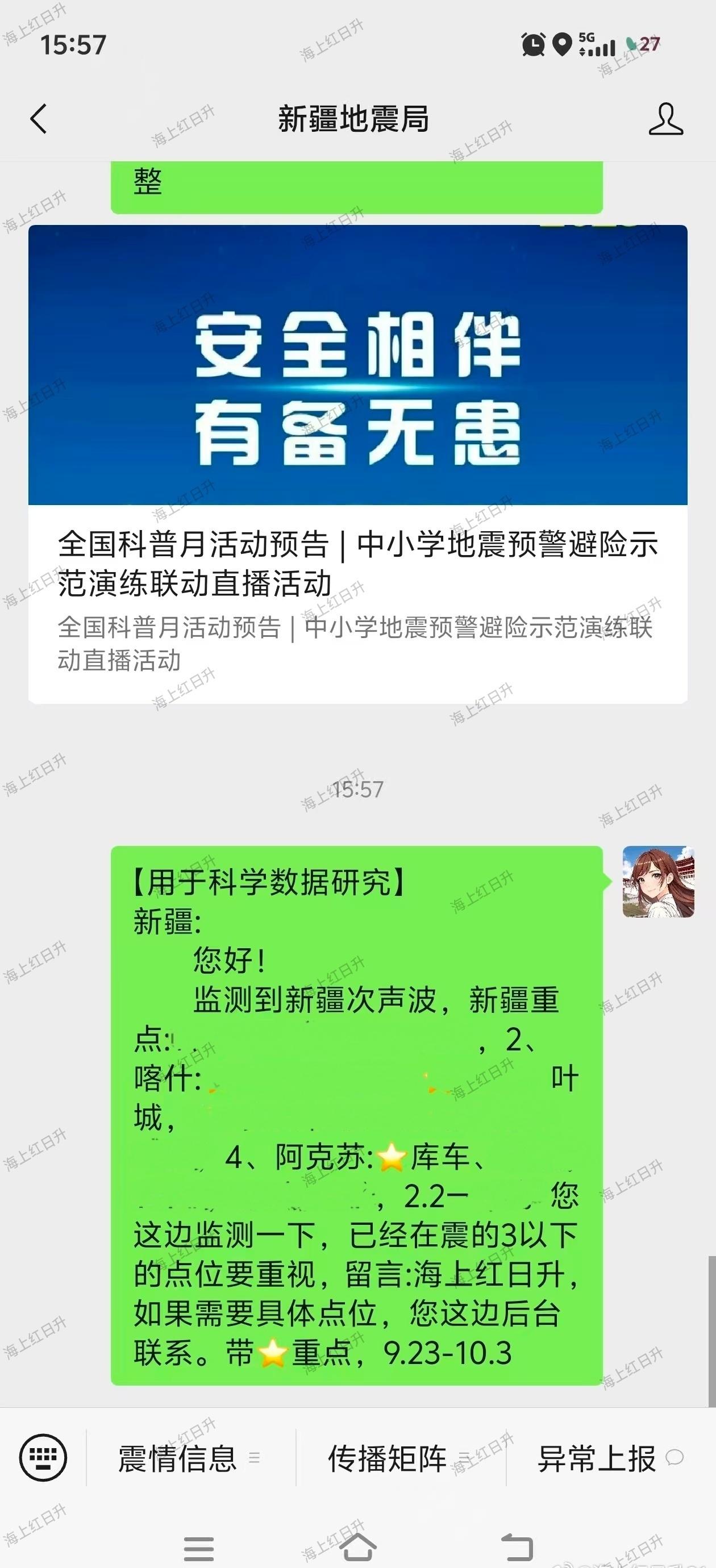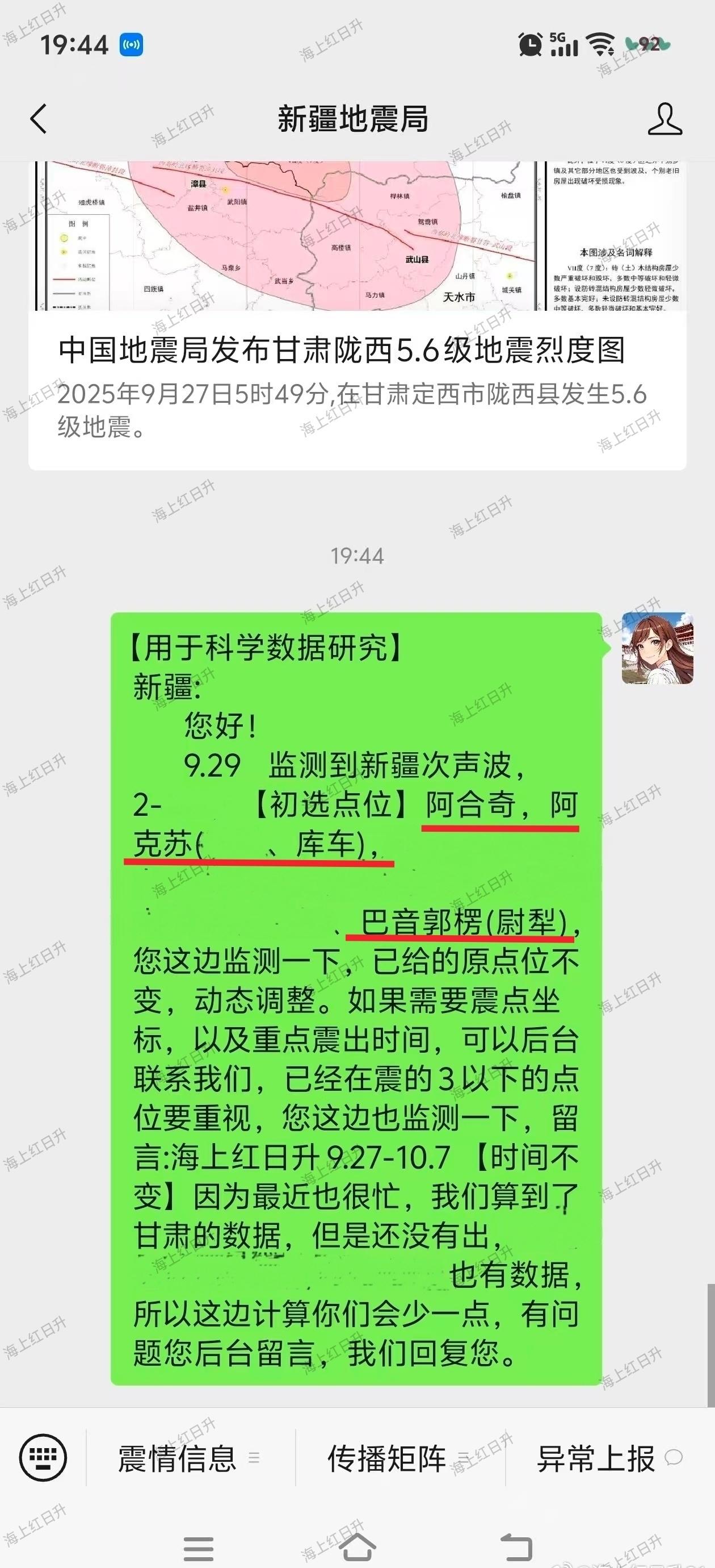 1、9月30日新疆乌鲁木齐市沙依巴克区3.2级 2、9月30日新疆巴音郭楞州焉耆县3.4级 3、10月2日新疆阿克苏库车县3.2级 4、10月2日新疆喀什地区叶城县3.9级 5、10月2日新疆克孜勒苏州阿合奇3.6级、3.0级 预测到上述6次低级别震,其中: 1、9月30日乌鲁木齐沙依巴克区,原预测点为同一市的米东区。 2、9月30日巴音郭楞州焉耆县,原预测为同一市的尉犁县。 上述2次为市、州一级一致,县级略偏,但远小于填卡要求,时间、震级符合9月23日、27日的预测。 3、10月2日库车、叶城、阿合奇共4次三要素符合23日、29日的预测。 4、临震时间计算准确,连续测到的新疆区域次声波准确。 5、并提前将信息发送至新疆自治区地震局,(注:新疆地震局不分节假日24小时全天侯值班,守护民生)