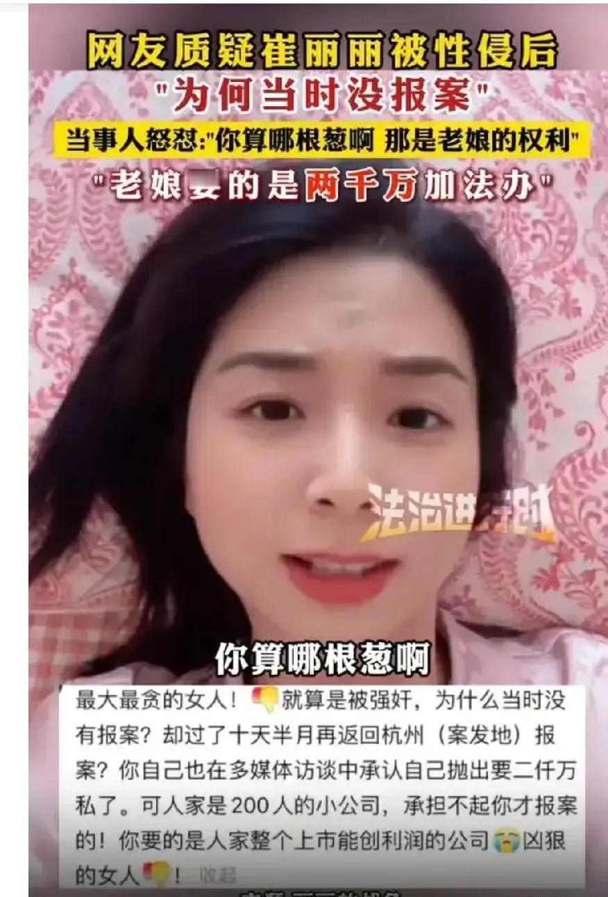 这个催丽丽,被公司老板强奸,在她老公的支持下,过了十几天才报案。 把她公司的老板送进了监狱,还要求赔偿2000万,还有公司股份。 王豪公司律师,在法庭上提交一份,催丽丽索要2000万的证据。 看来这2000万,是催丽丽私自索要的,王豪不同意。 才报案的吧。 她还在网上这么嚣张的叫嚣,明目张胆的索要钱财。 她这样子的目的,都是为了钱财。 看她那得意的样子,也不像受害者。 到时候王豪会不会反告她,敲诈勒索。
