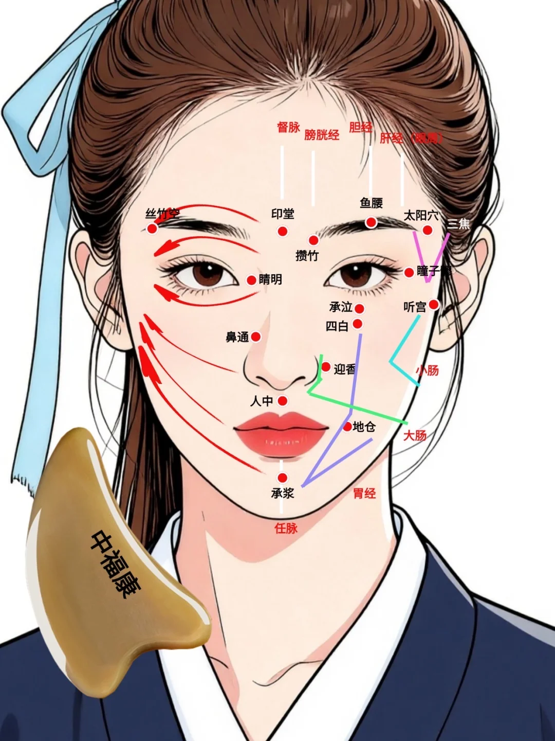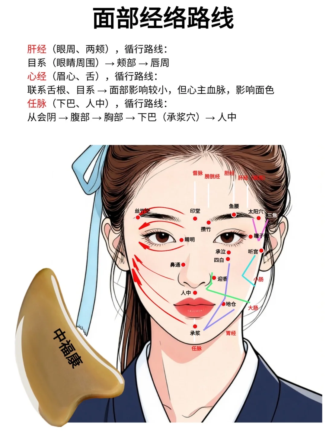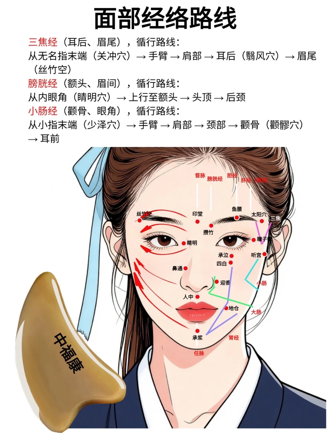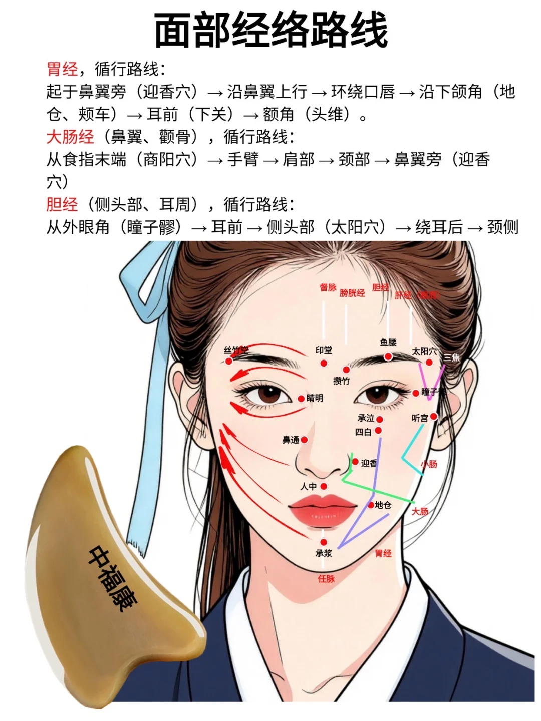 面部经脉不通现象,循行线路,刮痧板疏通方法
