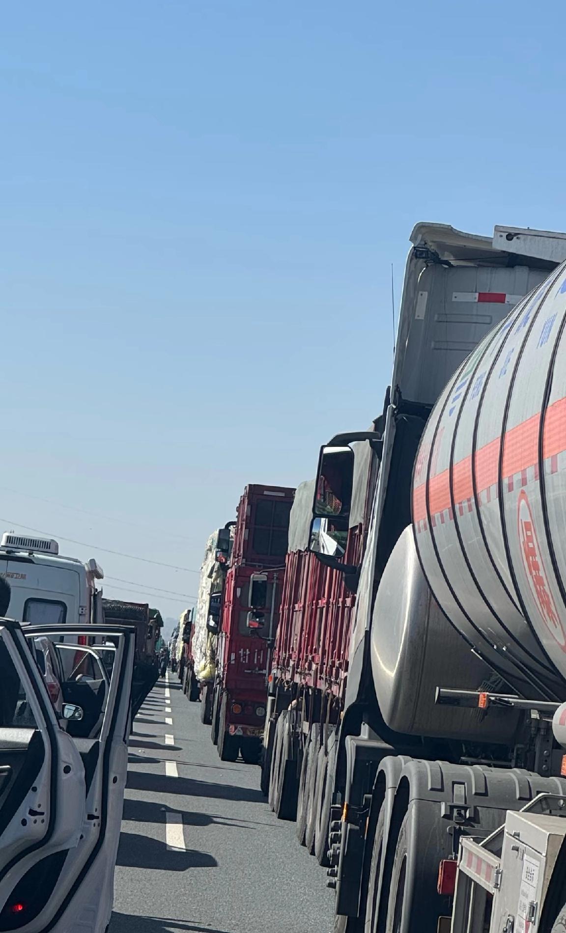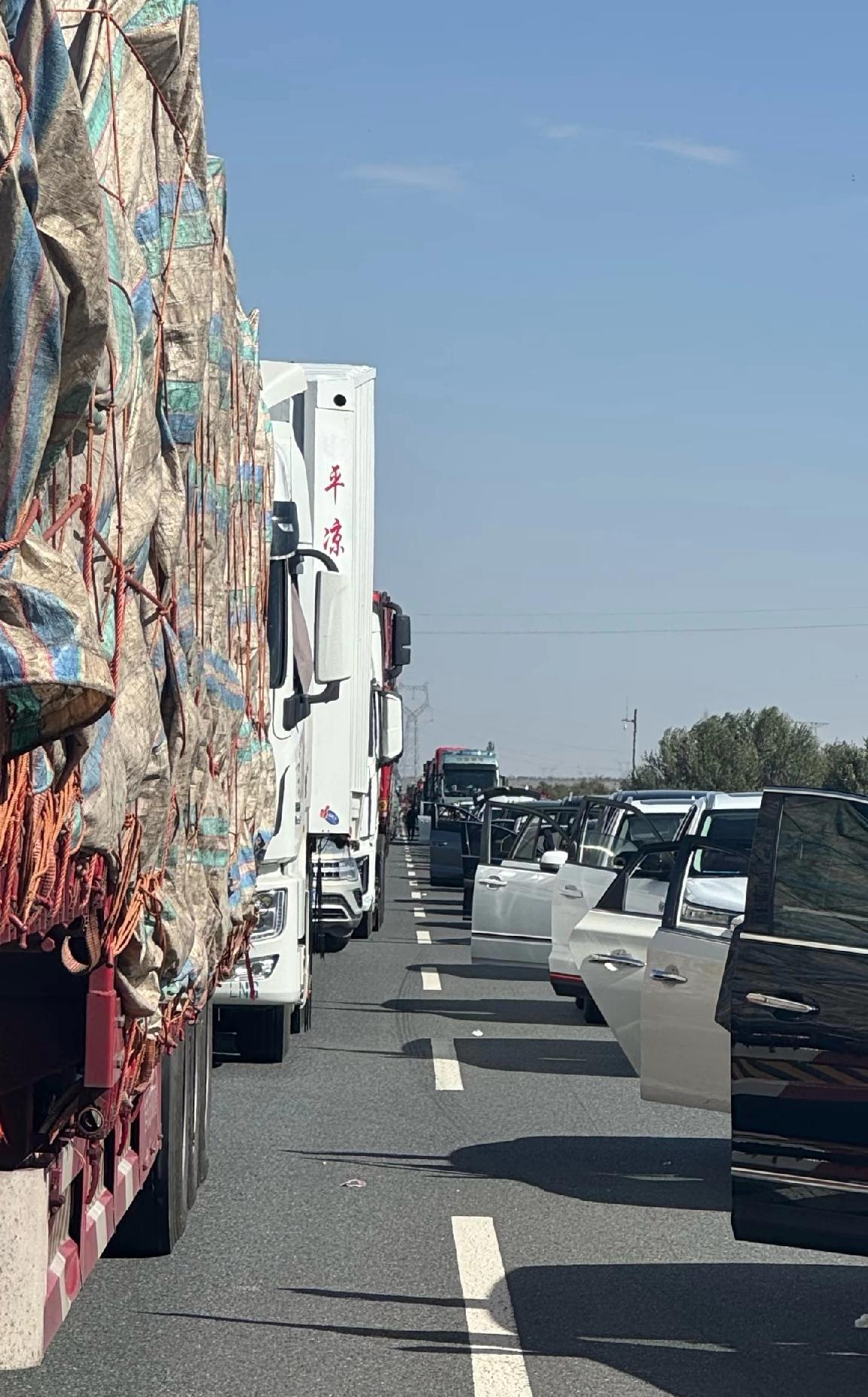 连霍高速🛣️货车侧翻 小车被压,拥堵5小时。 正在严重堵车中,部分高速道路被封,这条路大货车太多了,还不断超车。连霍高速甘肃段和新疆段应该扩为双向八车道,甚至十车道都可以。大货车太多了,可以说是一辆接着一辆。