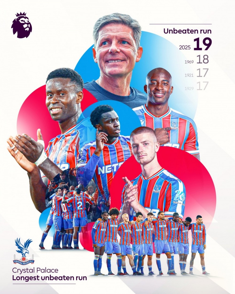 据英超官方统计,水晶宫各赛事19场不败,创造队史最长不败纪录。