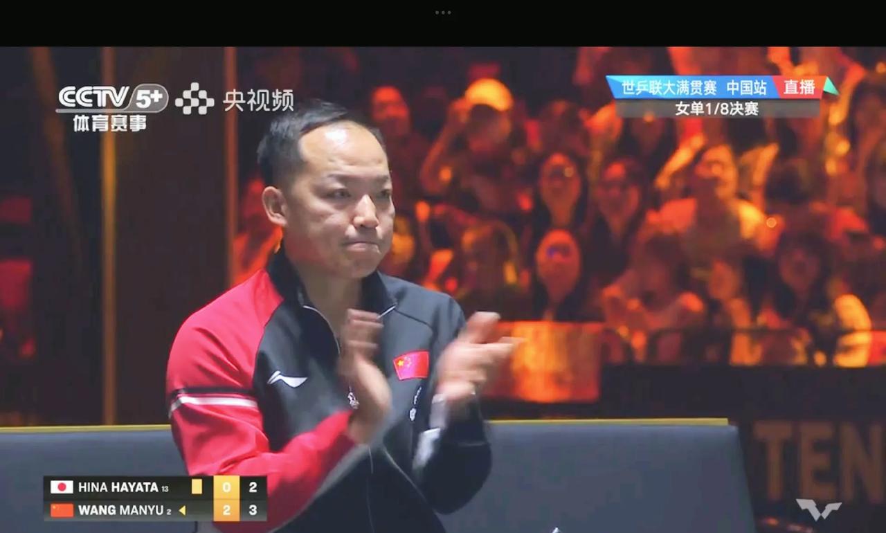10月02日,王曼昱对阵早田希娜比赛的场外教练,继续是任浩,虽然年轻,只有30岁,跟林高远同年,未来可期,王曼曼这场球打得无懈可击,早田希娜都被打懞了 王曼昱3:0早田希娜,挺进八强,双方打的节奏都特别快,喝口水回来,一局比赛就打完了,早田希娜在第二局时,在发球时想缓解下节奏,没想到被裁判黄牌警告,早田希娜也打乱了自己的节奏,而王曼昱越打越顺,当王曼昱赢下最后一分时,场外教练也是激动的站起来鼓掌 王曼昱的场外教练,由马琳暂时换成任浩后,感觉王曼昱更放得开来打,在赛场上更松弛,而任浩也会给王曼昱认真解题,真是太棒了 三局比分是: 11:6,11:4,11:5