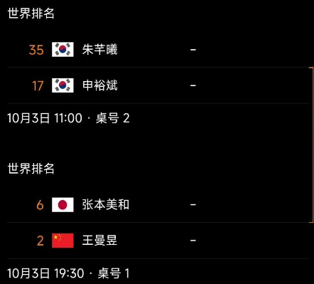 10月3日中国大满贯女单八强出来了。明天四组比赛争四强,八个人4个国乒运动员,其中一组内战,王曼昱继续抗日。 11:00申裕斌VS朱芊曦 11:45孙颖莎VS王艺迪 18:00陈幸同VS朱雨玲 19:30王曼昱VS张本美和 3日比赛一定很精彩,陈幸同最近状态不太好,打朱雨玲很吃力。孙颖莎打王艺迪应该赢得轻松。王曼昱遇到张本美和有可能还是硬仗,因为王曼昱好几年没输给日本队,现在日本女队运动员卯着劲想要拼王曼昱,赢王曼昱一次。