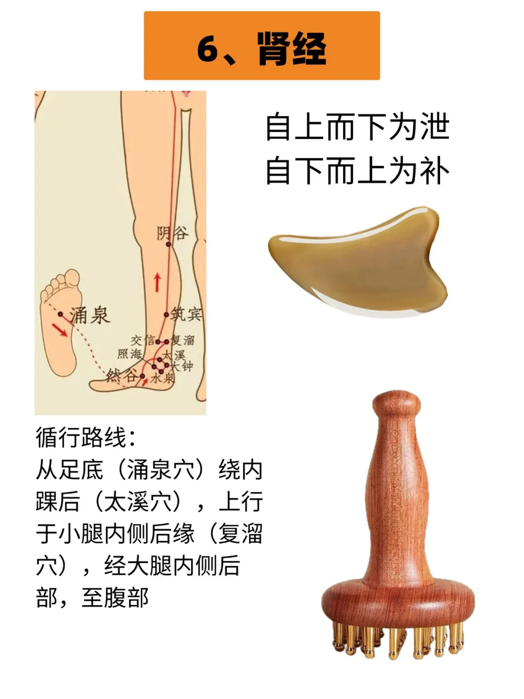 循行路线:从足底(涌泉穴)绕内踝后(太溪穴),上行于小腿内侧后缘(复溜穴),经大腿内侧后部,至腹部