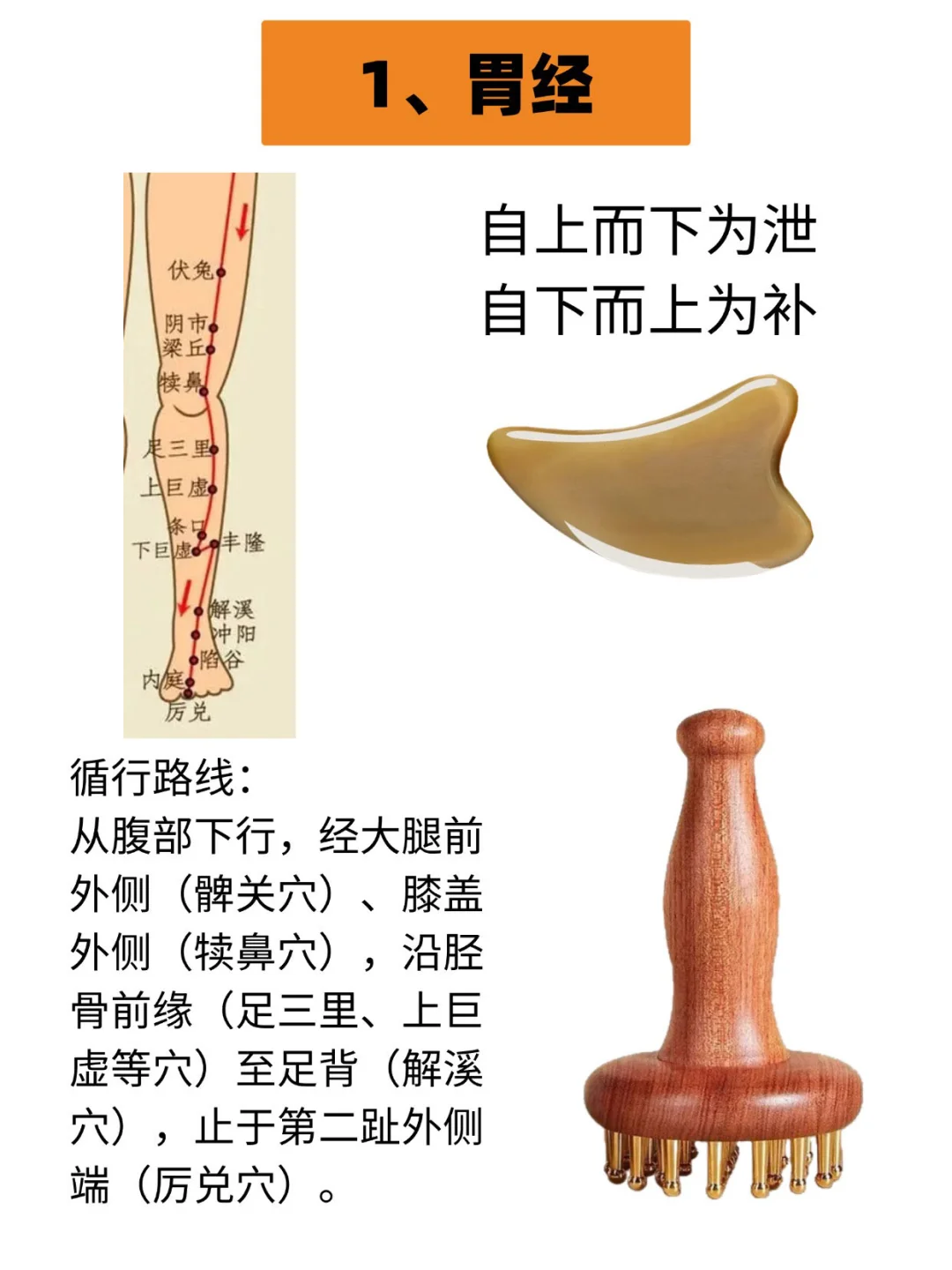 循行路线:从腹部下行,经大腿前外侧(髀关穴)、膝盖外侧(犊鼻穴),沿胫骨前缘(足三里、上巨虚等穴)至足背(解溪穴),止于第二趾外侧端(厉兑穴)