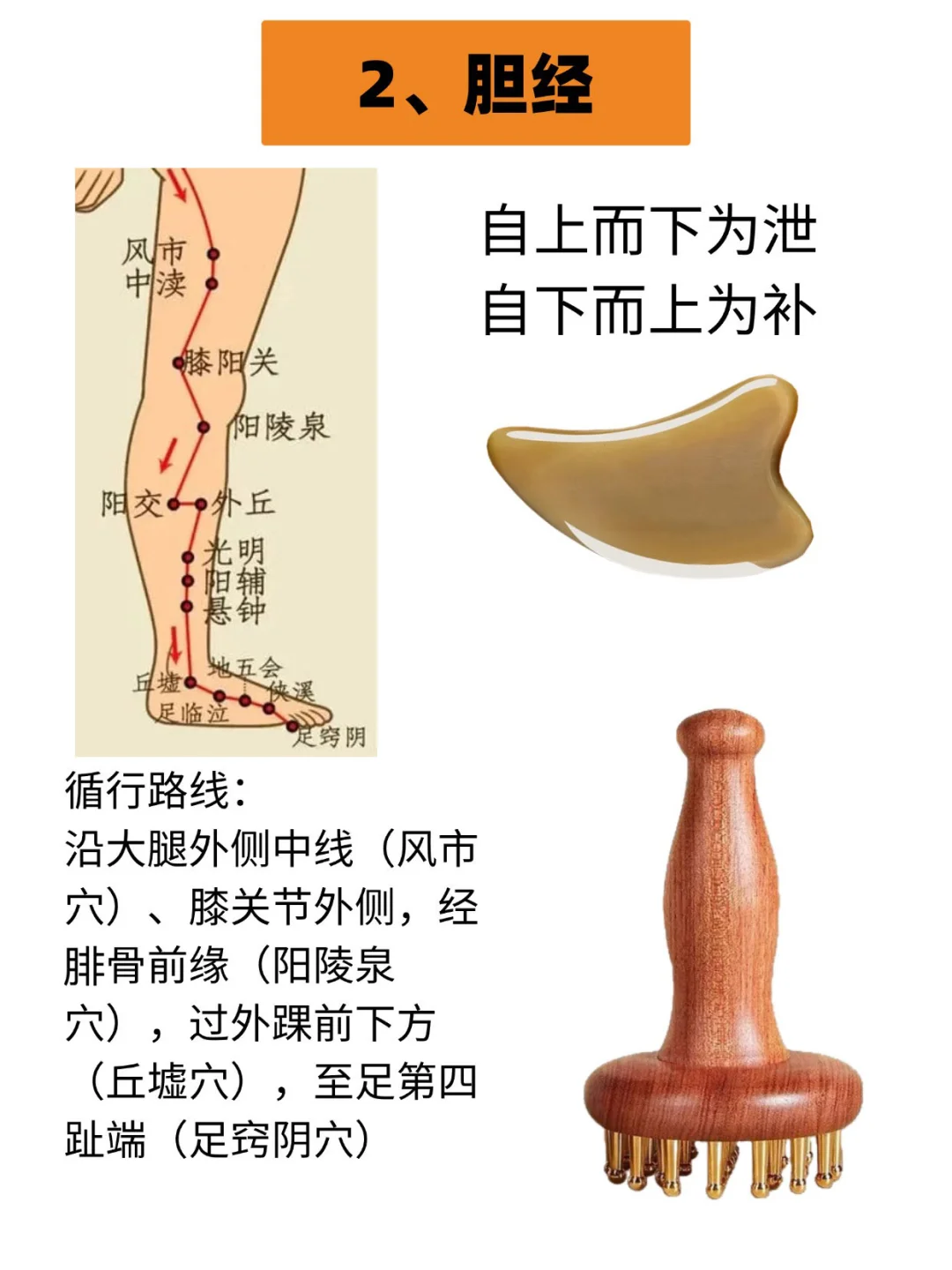 循行路线:沿大腿外侧中线(风市穴)、膝关节外侧,经腓骨前缘(阳陵泉穴),过外踝前下方(丘墟穴),至足第四趾端(足窍阴穴)