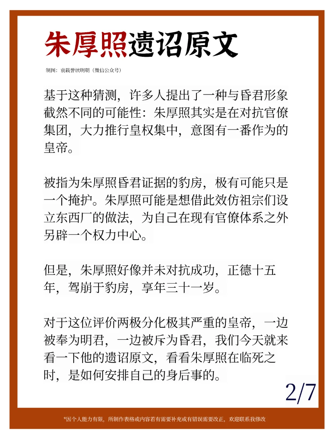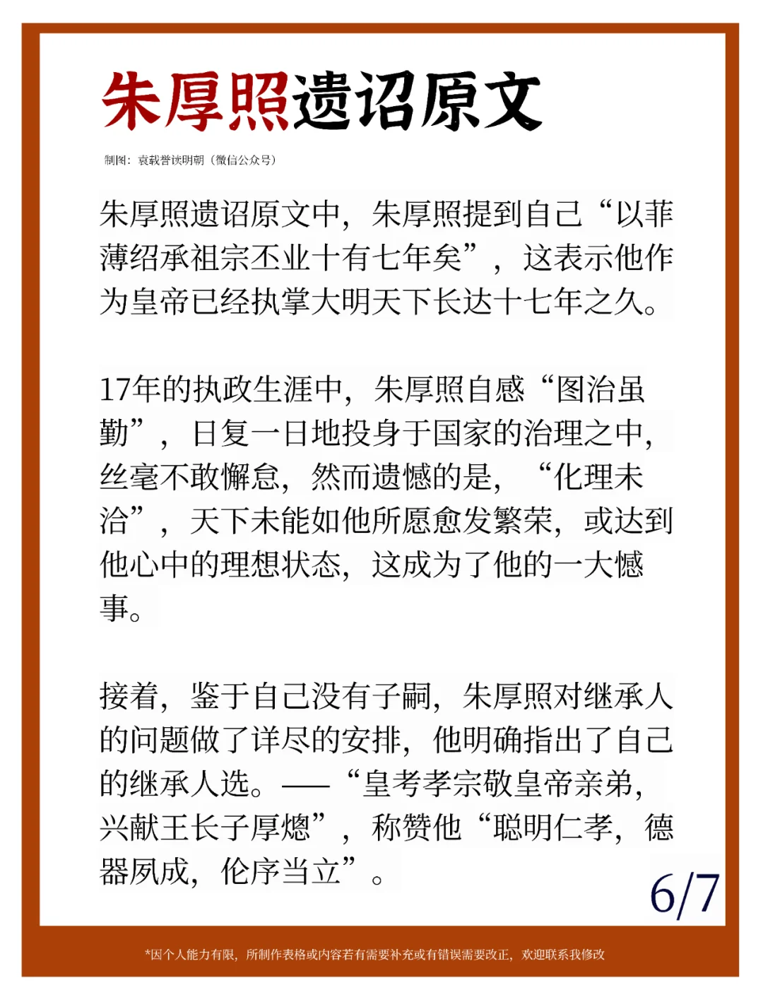 朱厚照遗诏原文中,朱厚照提到自己“以菲薄绍承祖宗丕业十有七年矣”,这表示他作为皇帝已经执掌大明天下长达十七年之久。