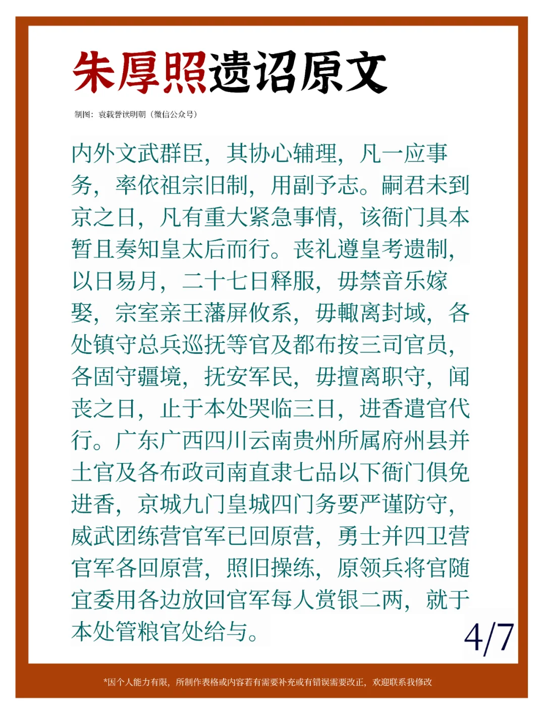 内外文武群臣,其协心辅理,凡一应事务,率依祖宗旧制,用副予志。嗣君未到京之日,凡有重大紧急事情,该衙门具本暂且奏知皇太后而行。丧礼遵皇考遗制,以日易月,二十七日释服,毋禁音乐嫁娶,宗室亲王藩屏攸系,毋輙离封域,各处镇守总兵巡抚等官及都布按三司官员,各固守疆境,抚安军民,毋擅离职守,闻丧之日,止于本处哭临三日,进香遣官代行。广东广西四川云南贵州所属府州县并土官及各布政司南直隶七品以下衙门俱免进香,京城九门皇城四门务要严谨防守,威武团练营官军已回原营,勇士并四卫营官军各回原营,照旧操练,原领兵将官随宜委用各边放回官军每人赏银二两,就于本处管粮官处给与。