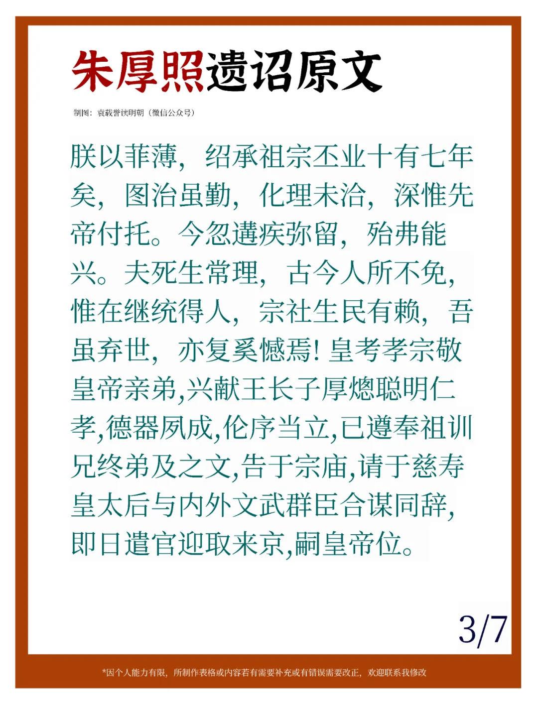 朕以菲薄,绍承祖宗丕业十有七年矣,图治虽勤,化理未洽,深惟先帝付托。今忽遘疾弥留,殆弗能兴。夫死生常理,古今人所不免,惟在继统得人,宗社生民有赖,吾虽弃世,亦复奚憾焉! 皇考孝宗敬皇帝亲弟,兴献王长子厚熜聪明仁孝,德器夙成,伦序当立,已遵奉祖训兄终弟及之文,告于宗庙,请于慈寿皇太后与内外文武群臣合谋同辞,即日遣官迎取来京,嗣皇帝位。