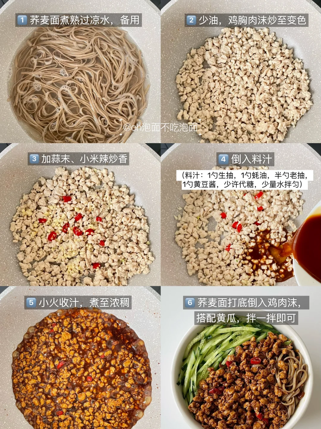 🥒食材:鸡胸肉(剁沫),荞麦面,黄瓜,料汁(1勺生抽,1勺蚝油,半勺老抽,1勺黄豆酱,少许代糖,少量水),蒜末、小米辣