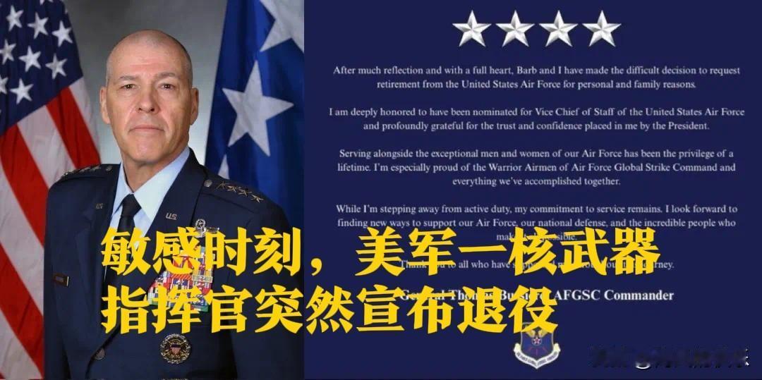 敏感时刻,美军一核武器指挥官突然宣布退役 据外媒报道美防长召开全美将军大会后第二天,美空军高级将领宣布退役。美国《国会山报》10月2日报道,在美国防长赫格塞思召集全球美军将领开会训话后第二天,美国空军上将托马斯·比西尔申请退役。 美国当地时间10月1日,比西尔在社交媒体上公开的申请退休信中称,退休是出于“个人和家庭原因”。 2022年12月以来,比西尔一直担任美国空军全球打击司令部最高指挥官,指挥美国全部空基和陆基战略核打击力量。 7月,他被特朗普提名为下一任空军副参谋长,但《航空周刊》9月初报道称,比西尔的提名被撤回。 全球美军将领大会9月30日在弗吉尼亚州匡蒂科的海军陆战队基地举行。在会上赫格塞思告诉将军们:“不认同我观点的人,你们可以离开。如果今天我说的话让你不满意,你可以选择马上辞职。我们越早找到合适的人,就能越快推动新政策”。之后美国总统特朗普上台发言称,谁想走,可以走,但这些人就得放弃自己的前程了。