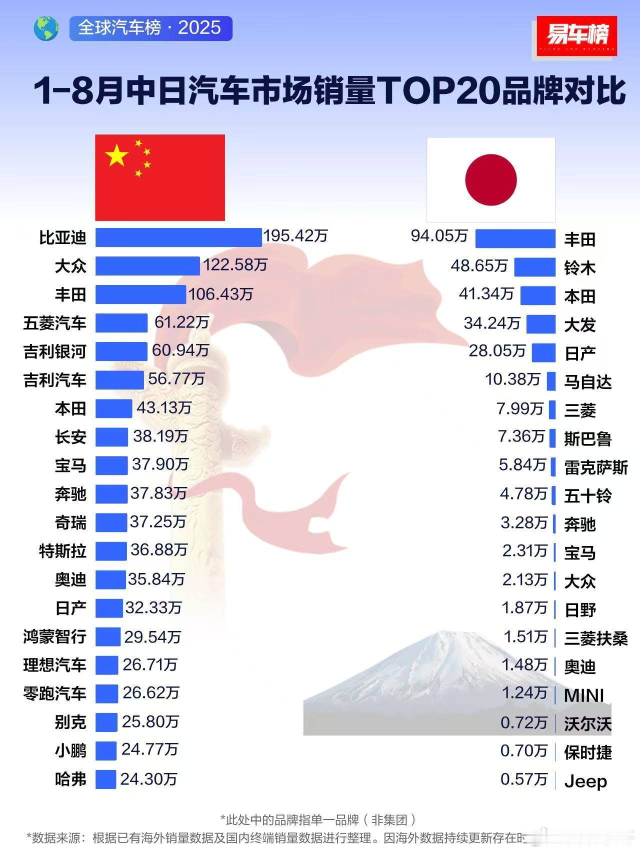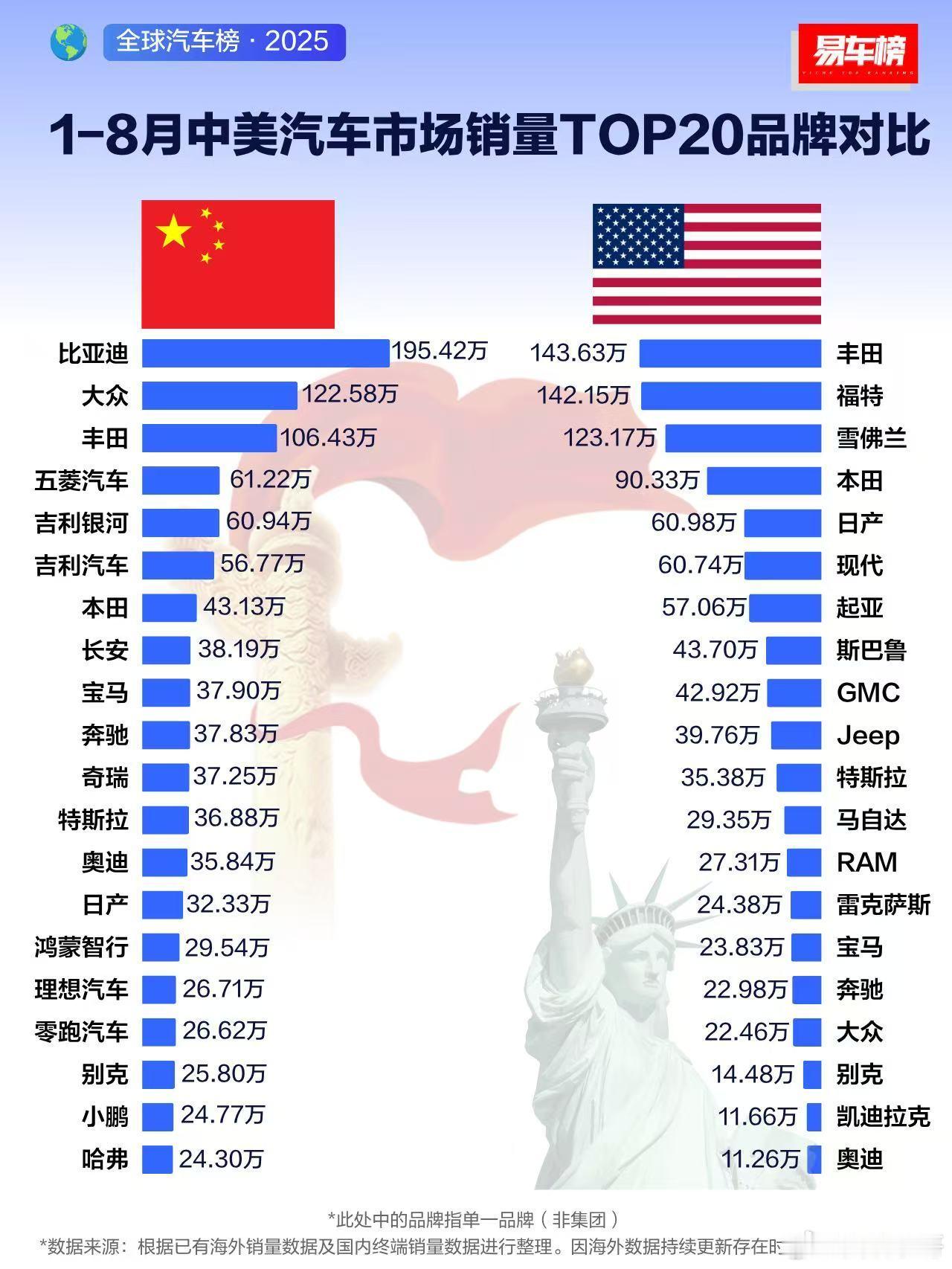 易车榜发布1-8月中美/日/德汽车市场销量TOP20品牌对比