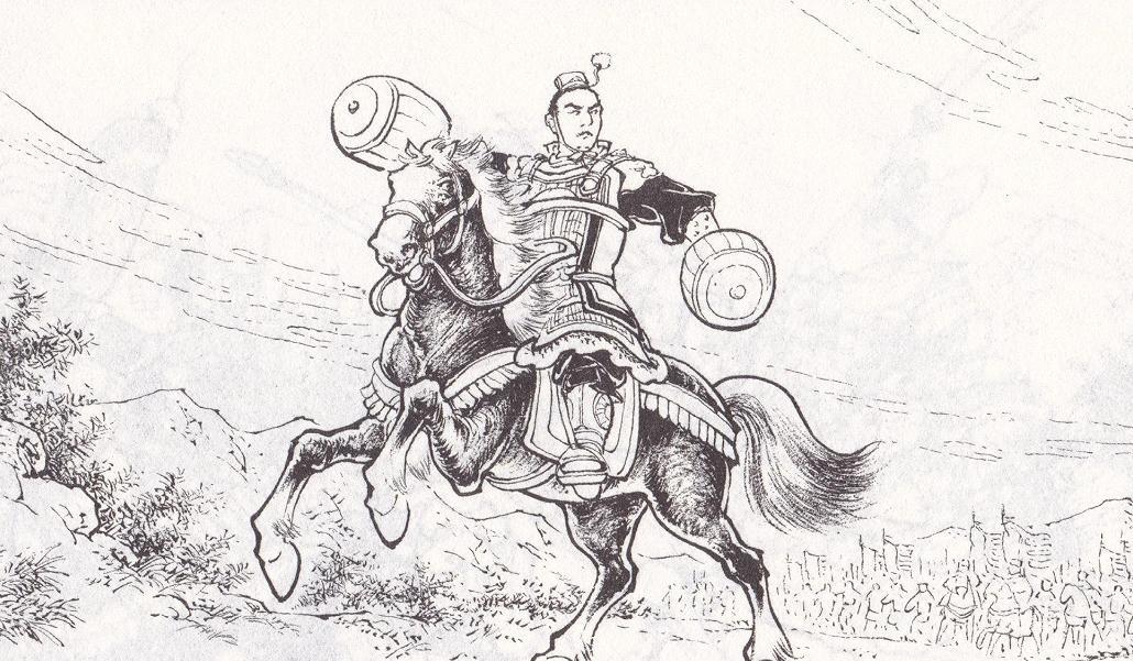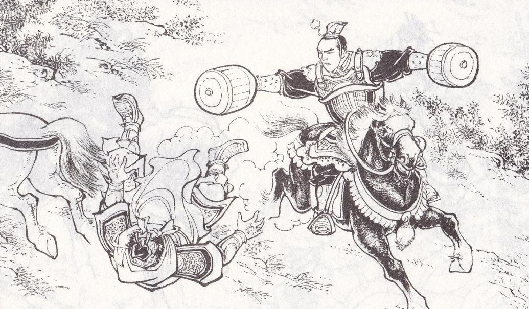 杨林带着李世民、柴绍、李元霸、宇文成都迎击十八路反王。李元霸撒马出阵,双锤一碰,尤如空中打了个霹雷:"反王听着,有不怕死的出来应战。"话音刚落,"金镗无敌将"伍天锡率先出阵,不过来的快回去的更快,李元霸抬锤就打飞伍天锡的兵刃。伍天锡一声大叫:好厉害,踅马回阵。“紫面天王"雄阔海提棍又出,李元霸哈哈大笑:黑哥哥,我喜欢你,我不打你。雄阔海气冲脑门:呸,要你喜欢,着棍吧。一棍砸向李元霸。李元霸双锤并拢:撒手吧!雄阔海顿时大棍脱手。随后李元霸双锤又是一碰"当"的一声巨响,竟将雄阔海震于马下:"黑脸哥哥,别练棍了,回去好好练枪吧!后来雄阔海果然弃棍学枪了。接着,李元霸锤砸吴可玄,打断口北王福克宗坦的独脚铜人,磕飞沙漠王罗子都的板门刀。正当李元霸扬威两军阵时,惹恼了一位英雄,飞马而来,谁呢?