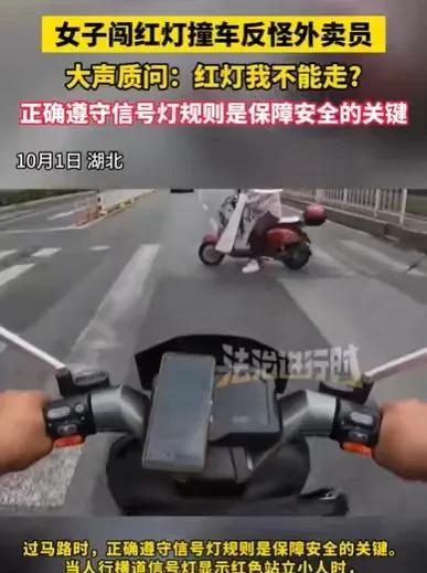 湖北,女子在马路上横冲直撞,根本不看红绿灯,眼看前方无车,一扭油门,就过人行道,结果撞到了从右边过马路的外卖小哥,外卖小哥恼怒地问她:“你没看红灯啊?”不料女子理直气壮地说:“那红灯,没看到啊,红灯,我就不能走吗?我能不能走?” 外卖小哥听到女子这逆天的言论,整个人都感到气愤了,他不知道这女子竟然会如此无理。 就在刚刚,外卖小哥着急送单,毕竟他的送餐时间都是有限的,都需要在规定的时间,把餐送到客户那里,否则就有可能被投诉,被扣钱了,这样真的很难。 但即使再赶时间,他也会遵守交通规则,当他要穿过马路时,只见红灯亮了,他只好着急地等待着。 好不容易等到绿灯亮了,他便一扭油门,赶紧走,因为是绿灯,因为时间比较着急,他就没有太过于关注周围的环境,他只看到前方无人,这个时候,如果大家都遵守交通规则,是不会有意外发生的。 外卖小哥的工作就是穿梭在大街小巷上,他不知道自己已经过了多少次人行道了,也不知道自己有多少次是这么急过马路的,每次匆匆而过,都没有发生过意外。 可这一次,他碰上了,他一扭油门,刚往前没几步,就撞上了一个女子的电动车。 原来这个女子,过马路没有看红绿灯,她看到前方没有车,一扭油门就想闯红灯,结果就撞上了外卖小哥的车。 外卖小哥看到女子是闯红灯,耽误了他的时间,还撞到他,瞬间恼怒地问女子:“你没有看到红灯吗?” 毕竟在当时,女子闯红灯,如果大家的车速再快一点,又相撞得严重,那后果真的不堪设想。 让外卖小哥意外的是,他遇到的竟然是无理女,女子竟然没有半点知错的意思,反而理直气壮地质问外卖小哥:“那红灯我没看到啊,红灯,我就不能走了吗?” 说完之后,她还不罢休,又来了一句:“我能不能走?” 一听这话,外卖小哥气得手都要抖了,女子撞到他,不但没有道歉,还着急着要走。 这一次他们都还算幸运,如果他们相撞得厉害,估计大家都躺在地上等待救援了,谁也走不了了。 现在女子却完全没有意识到,这个问题的存在,遇到这样的女子,外卖小哥怕了。 当时他怕的是,如果公路上多几个这样的无理女子,那交通规则该会乱成什么样了。 他不知道这个女子是不是被父母宠爱长大的,也不知道这个女子是否是被众星捧月,别人都把她捧在手心里的,她就如同一个被惯坏的女子,横冲直撞在马路上。 似乎马路就是她家,她想怎么样就怎么样,红绿灯都是摆设,只要前方无人,她就可以通车,马路上有这样的女子存在,真的太危险了。 是的,这个女子如果没有遵守交通规则,如果长期视红灯而不见,经常闯红灯,那么肯定会发生意外的,这一次是小事故,只是轻微地碰了一下,但下一次谁能保证,她还有那么的幸运呢? 如果她长期闯红灯,她不幸运,这是必然的,但是别人呢,和她相撞的人就倒霉了,不但有可能受伤,还有可能要赔偿。 不遵守交通规则,不看红绿灯,这真是害人害己。 外卖小哥看着着急要走的女子,他真的很希望女子能够吸取教训,不要视红灯而不见,不要闯红灯了,否则真的会发生严重的意外。 那么如何认定女子闯红灯的行为呢? 首先,不管女子是开车还是走路,她都不能闯红灯。 《道路交通安全法》第90条规定:机动车驾驶人违反道路交通安全法律、法规关于道路通行规定的,处警告或者二十元以上二百元以下罚款。 闯红灯作为违反道路通行规定的行为之一,将受到此条款的处罚。 其次,发生这一次事故,是女子有错在先,外卖小哥是正常行驶,女子是闯红灯行驶,因此发生的所有损害都应当由女子来承担。 《民法典》第1165条规定:行为人因过错侵害他人民事权益造成损害的,应当承担侵权责任。 因此在这一次事故中,如果外卖小哥的车受到损害,或者送餐延迟受到的损失,都可以要求女子赔偿。 那你对女子的行为有何看法呢?#头号创作者激励计划#