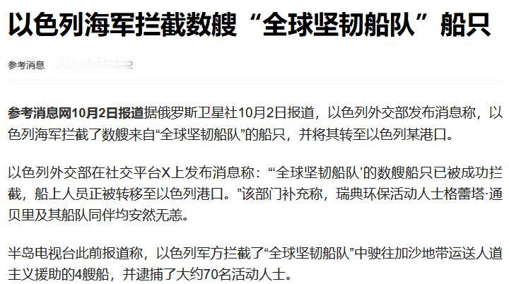 以色列宣布:已阻止所有“全球坚韧”船队船只。 10月2日,以色列突然宣布已经拦住了所有要去加沙的“全球坚韧”船队,消息一出来全世界都在关注。 这支船队足足有40多艘船,500多个来自30多个国家的人参与,里面甚至有前总统的孙子、欧洲议员和医生这些知名人士。他们船上装了5500吨救援物资,全是加沙老百姓急需的面粉、婴儿食品、药品这些东西。 船员们甚至早就做好了最坏的打算,就是想让全世界看看加沙有多难,能早点帮那里的人摆脱困境。要知道加沙现在连新鲜食品和燃料都进不去,这些物资对他们来说就是救命的希望。 那以色列是怎么拦的呢?他们先是干扰船队的通信信号,然后半夜登船把船扣了下来,目前已经扣了13艘,200多人被扣押。 以色列军方说这么做是为了防安全威胁,怕有危险物品混进去。但船队和很多国家都不认同这个说法,委内瑞拉外长直接说这是“用饥饿当武器”,土耳其更狠,称这是“恐怖主义行为”。 这事儿在国际上也闹得沸沸扬扬。欧洲那边反应特别大,意大利好几万人上街抗议,还说要罢工;哥伦比亚直接把以色列外交官赶了出去,废止了贸易协定;德国、法国这些国家也纷纷要求以色列遵守国际法,放了被扣的人。 联合国人道主义机构更是急得不行,呼吁赶紧打开通道让物资进去,强调现在保护平民、送救济品是最要紧的事。国际红十字会也跟着呼吁,希望两边能坐下来谈,别耽误了救人。 其实加沙的困境早就不是一天两天了,现在只有一个凯雷姆·沙洛姆过境点能进物资,每天100辆卡车的配额里,一半以上都滞留在口岸送不进去。加沙的老百姓缺医少药,连干净水都喝不上,医院里连基本的救治设备都不够。 “全球坚韧”船队本来是带着希望去的,结果却被拦了下来。这事儿不光是拦截了一支船队,更让大家看清加沙人道主义危机有多紧迫。 现在国际上越来越多的声音要求结束这种局面,毕竟不管有什么分歧,平民不应该受牵连。希望各方能早点放下争执,让救命的物资赶紧送进去,别让加沙的老百姓再苦苦等待了。