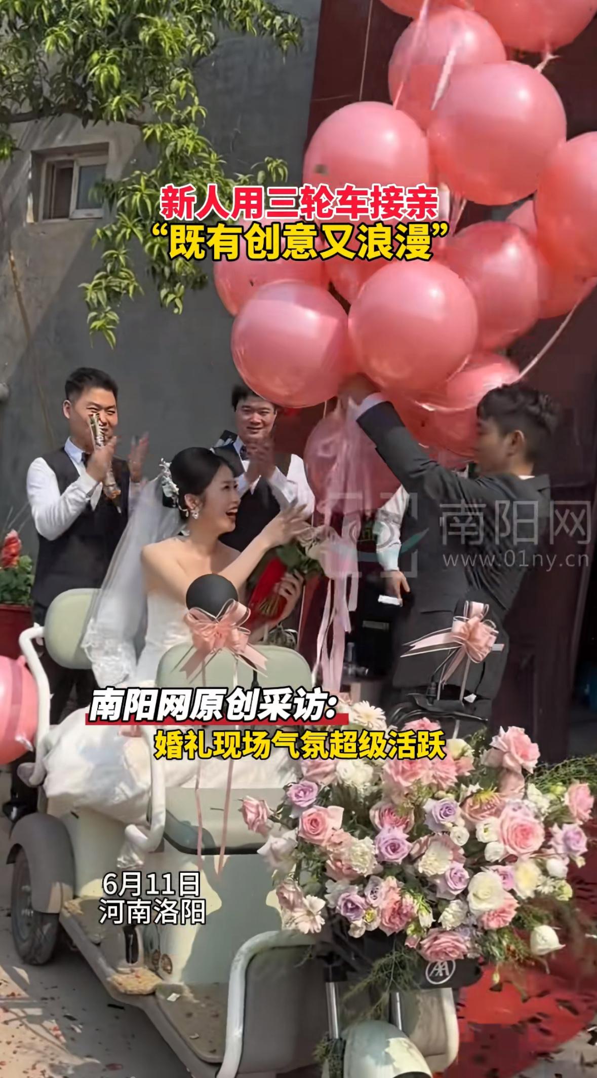 “快看!三轮车车队来了!”河南周口街头,一队挂着红绸、贴着喜字的电动三轮车缓缓驶