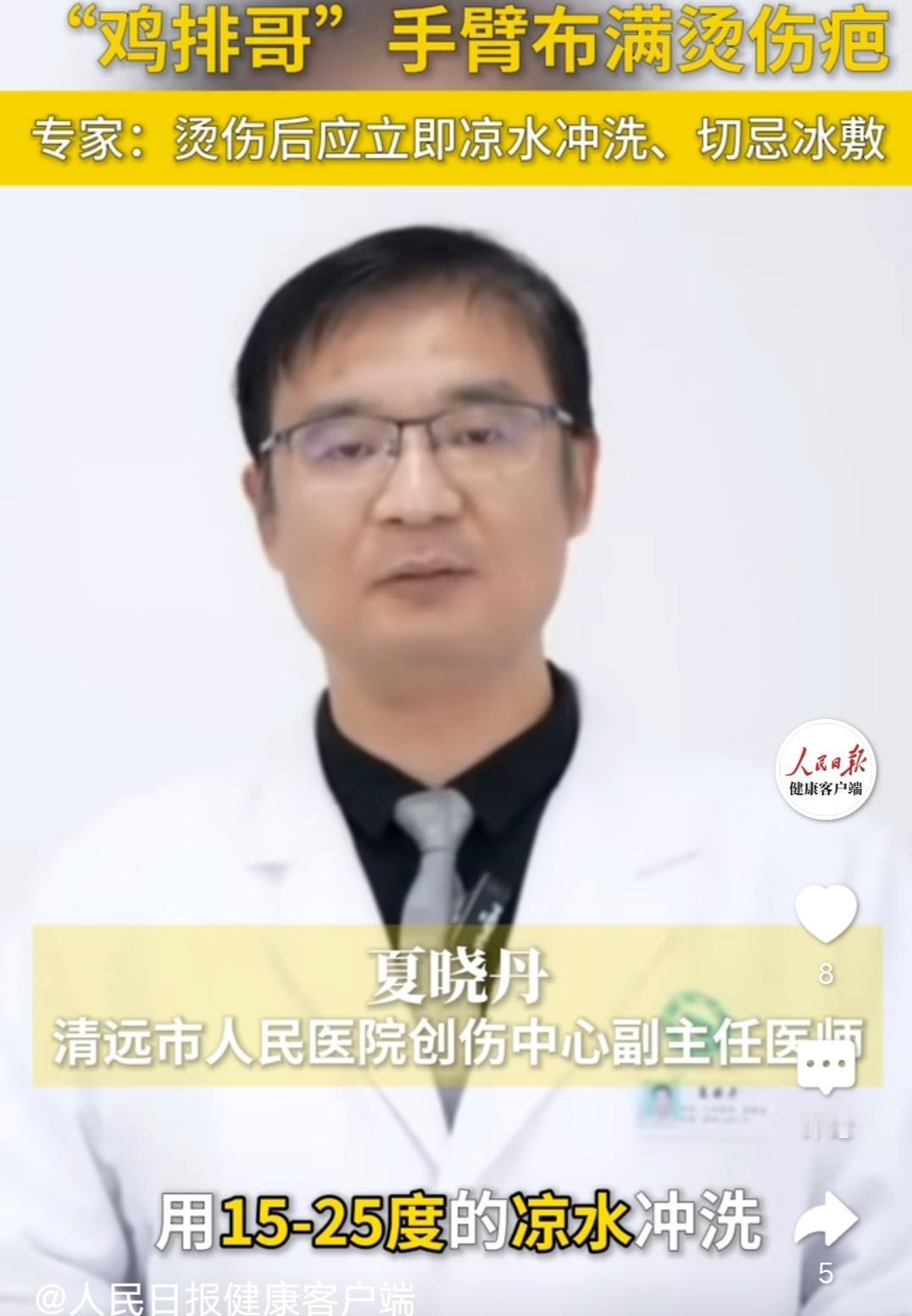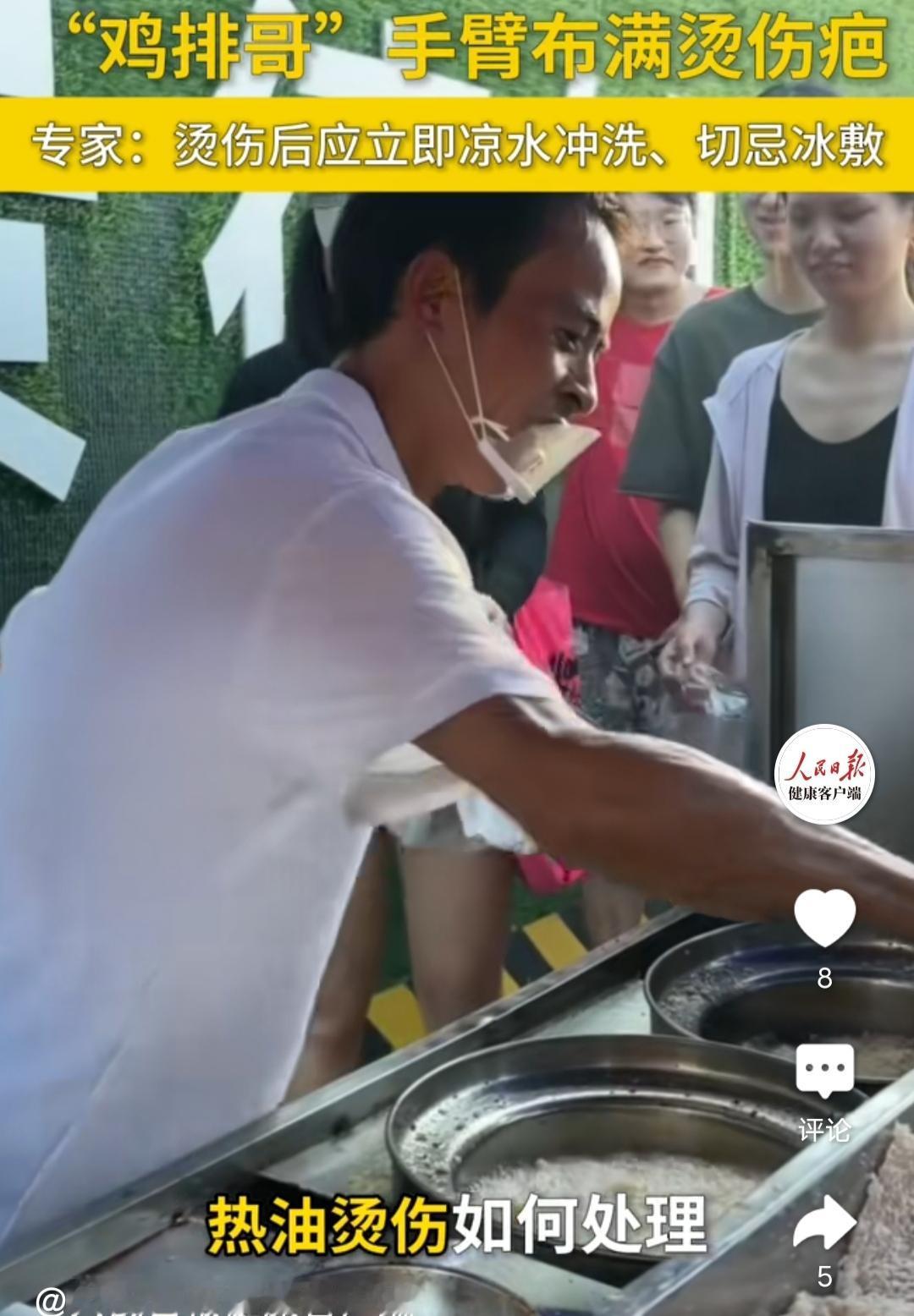 “鸡排哥”手臂布满烫伤疤,专家:烫伤后应立即凉水冲洗、切忌冰敷。 来自相关媒体的报道,最近,江西景德镇“鸡排哥”火爆出圈。有记者探访时发现他手臂布满热油烫伤疤。 后来就带入一段专家的建议,烫伤后立即用凉水冲洗或浸泡15-30分钟。专家说得对,这是家常意外烫伤的处理方法,但在我看来,这不适合鸡排哥啊,视频里看,鸡排哥做的是卖炸鸡排的买卖,热油烫伤了他立马去用凉水冲或浸泡,那锅里的鸡排不就被炸糊了,谁还买?难道关火去处理了来让顾客等着?你看谁会等? 所以,很多时候不是专家说得没道理,而是条件不允许。红尘中的我们,生存得好都不是那么容易的事,大家都加油吧,日子会越老越好。