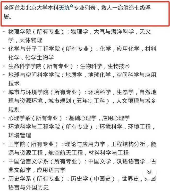 网上有中年家长言辞犀利地称“北大75%都是天坑专业”,还列出清单自证。所谓“天坑