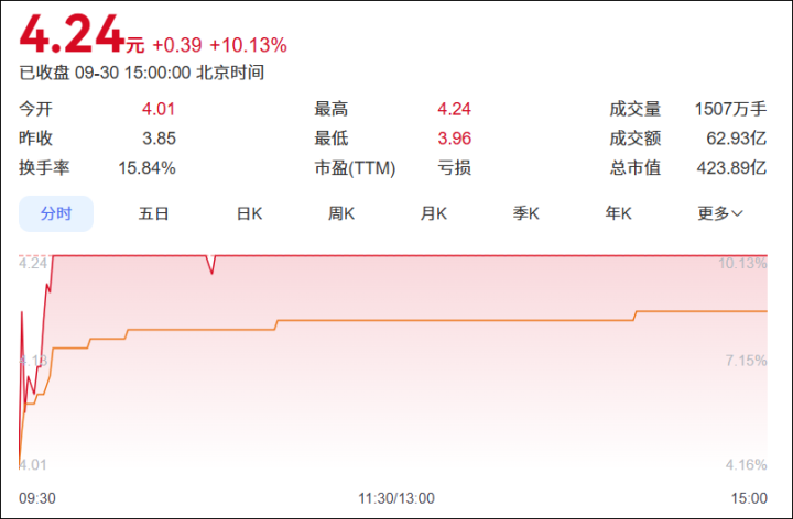 大概也是因为受上述传闻的影响,山子高科9月份的股价走出5连板,5天涨幅超50%。国庆节前最后一个工作日(9月30日)更是以涨停收盘,收盘价4.24元。而在一年前的7月25日,山子高科曾因股价跌破1元,一度出现被终止上市的风险。