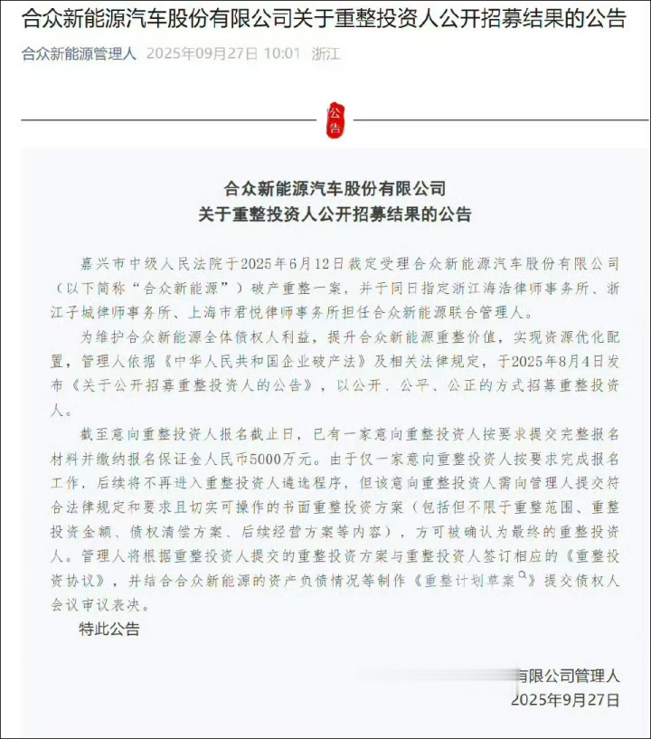 9月27日,合众新能源(哪吒汽车母公司)管理人发布公告,称重整投资人招募取得实质性进展:已有一家(且仅有一家)意向重整投资人按要求完成报名工作,不仅按要求提交了完整的报名材料,更缴纳了5000万元报名保证金,待该意向重整投资人提交切实可操作的书面重整投资方案后,再确定其是否为最终的重整投资人。
