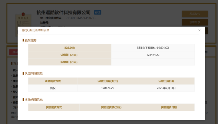 最新的工商登记信息显示,位于杭州未来科技城187号地块的OPPO全球移动终端研发总部项目,已在今年7月份被整体转卖给A股上市公司“山子高科”旗下子公司——浙江山子超影科技有限公司,后者以债权形式认缴出资17.8亿元(目前尚未公示实缴明细信息)获得该项目所属公司杭州逗酷软件科技有限公司95.5%的股权。