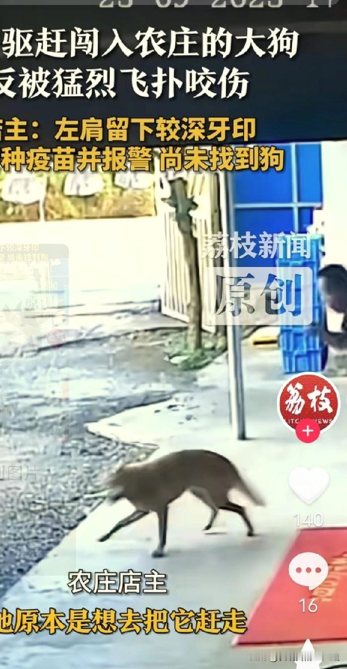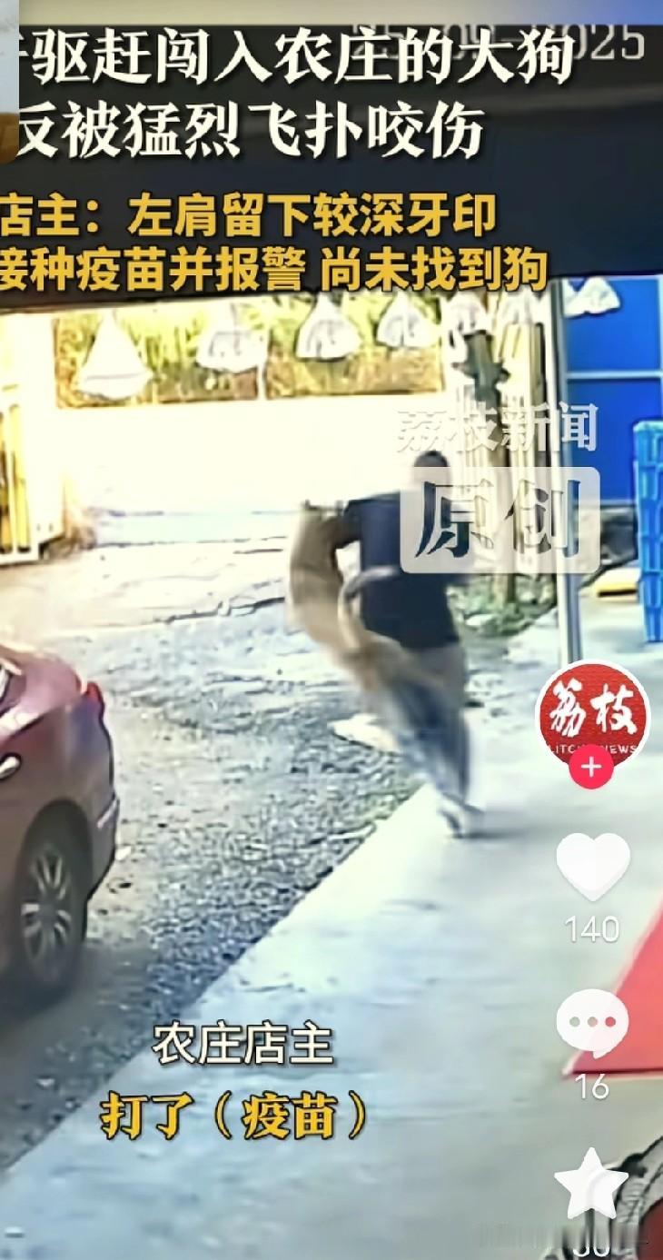 太可怕了!”广东韶关,一农庄老板正在看店,忽然,一只大黄狗遛进院里,担心咬伤客人,老板急忙上前驱赶,没想到大狗不仅没逃,反而朝着他飞扑过来,跳起来咬伤了他的左肩!事后,老板报了警,警方正全力搜寻该犬只。网友:看着不像流浪狗。 监控画面记录下惊险一刻。这只大黄狗闯入农庄院子时,店主本能的反应是保护客人安全。他靠近时狗突然跃起扑向他的左肩,留下清晰的牙印。店主妻子事后透露,丈夫左肩受伤后立即前往防疫站接种了狂犬疫苗,这是开店多年来第一次遇到这种事。 警方接到报案后展开搜寻行动。乌迳派出所民警介入处理,店主提供了监控录像和犬只特征协助调查。截至9月27日,涉事犬只和其主人尚未找到,搜寻工作仍在进行中。 网友讨论焦点集中在这只狗的行为特征上。不少人觉得它不像流浪狗,体型壮实、毛色均匀,更像是家养犬只。流浪狗通常对人保持警惕,而这只狗主动闯入人类活动区域并表现出攻击性,确实符合部分家养犬护主或护领地的特征。 类似事件在韶关地区并非首次发生。2024年夏季就有农户被闯入的牧羊犬咬伤案例,最终找到狗主人并获赔偿。农村地区犬只管理存在明显漏洞,散养家犬和流浪狗形成混合群体,攻击性会随群体效应增强。 法律层面存在责任认定难题。若能找到狗主人,《民法典》明确规定饲养动物造成他人损害应承担侵权责任。但若是无主流浪狗,被咬者只能自行承担医疗费用。韶关部分地区试点犬只登记制度,但覆盖范围有限。 农庄老板的遭遇折射出公共安全管理短板。公共场所监控系统能记录事发过程,却无法预防动物伤人事件。相关部门需要建立更有效的犬只管理和流浪动物收容机制,避免类似事件重演。 各位读者你们怎么看?欢迎在评论区讨论。