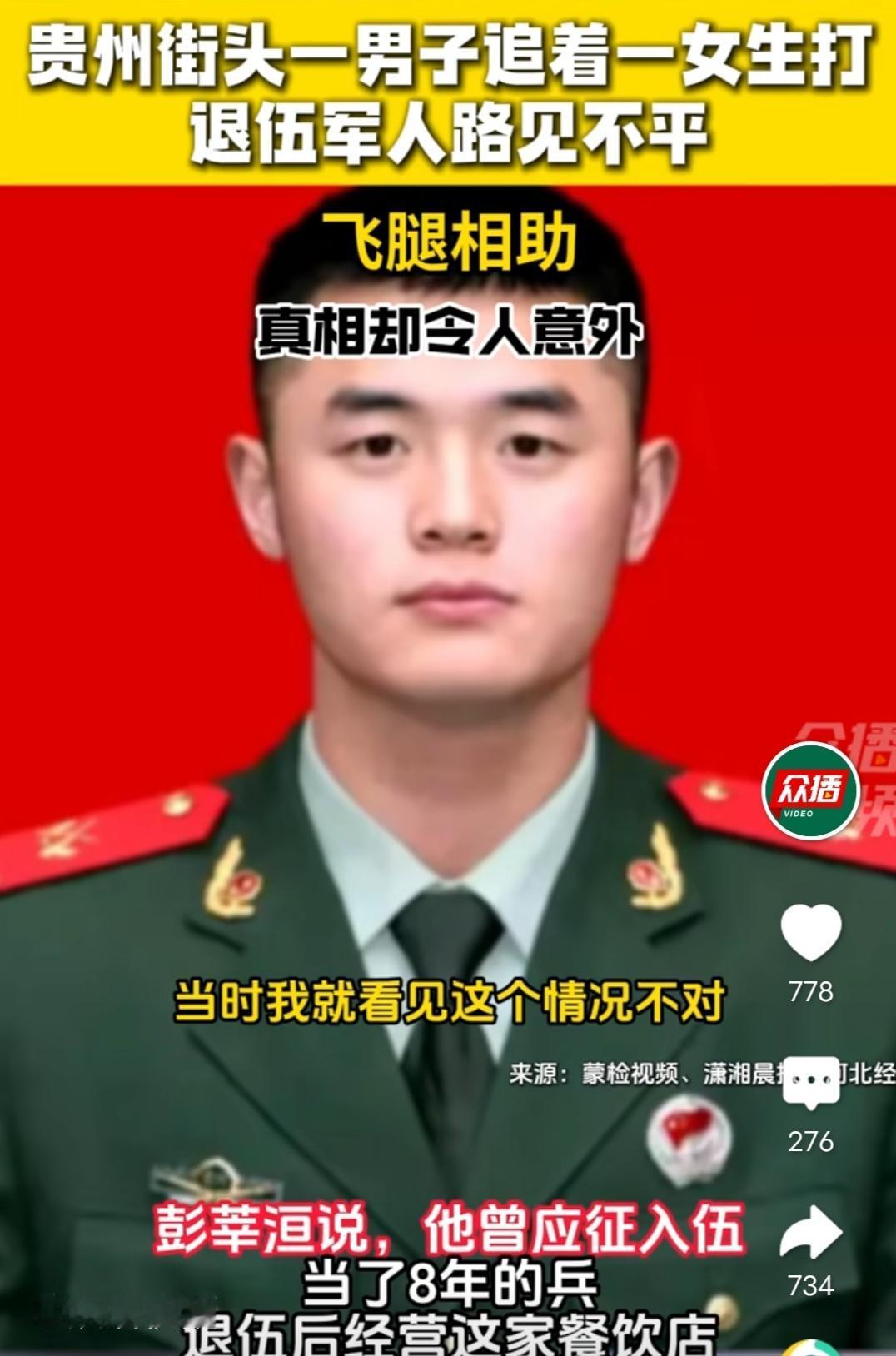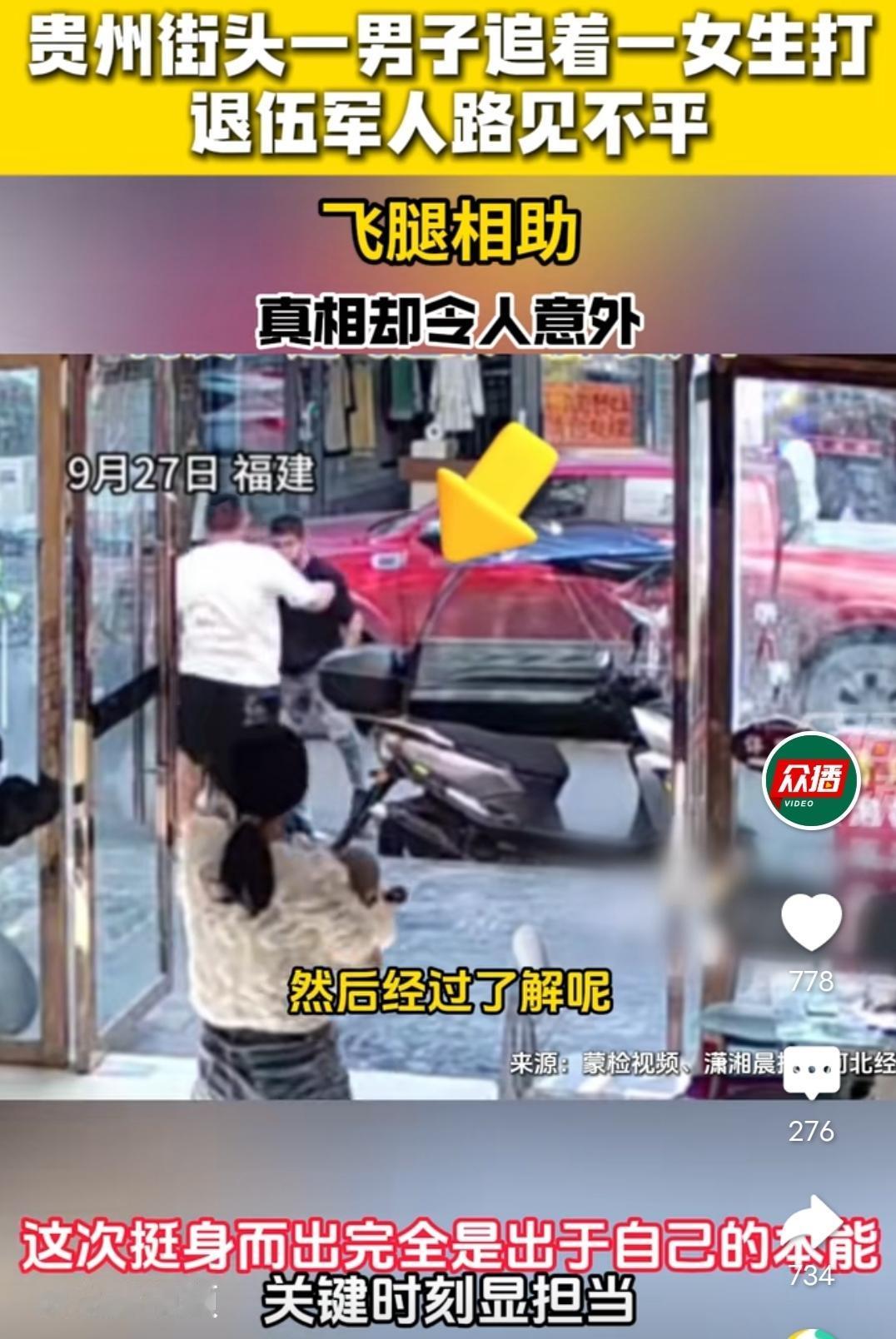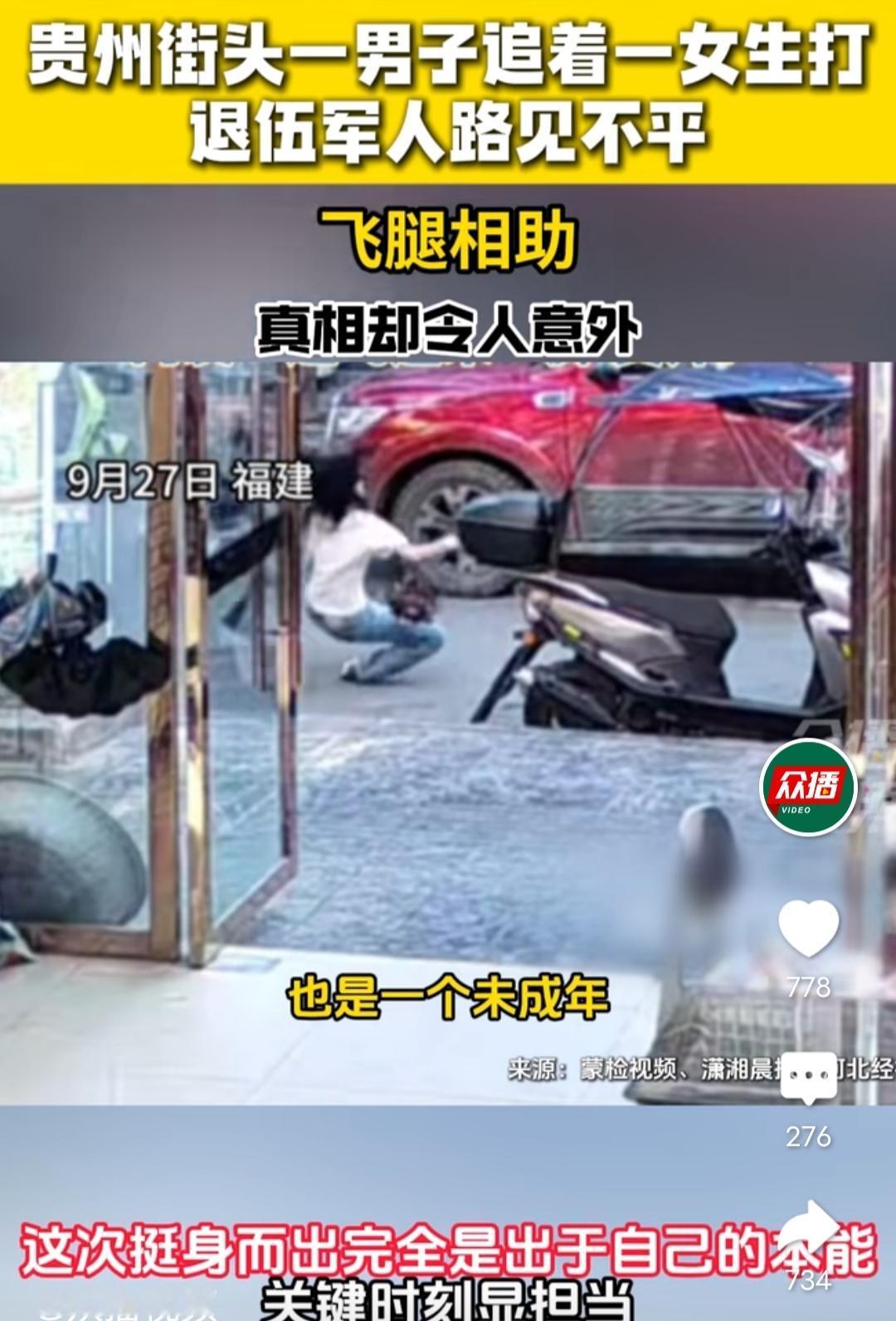 贵州街头一男子追着一女生打,退伍军人路见不平,飞腿相助,真相却令人意外。 来自)相关媒体的报道,在贵州毕节市金沙县街头,退伍军人彭梓洹在这街上开着一个餐饮店,近日,他看到一男子在街上追着一个女生打,追到马路中间时,男子一把抓住女孩子的头发,然后一脚踹到肚子上,彭梓洹看不下去了,立马冲出去,飞起给那男的一脚,并把对方制止住了,后来经过了解才知道,这男子跟这女孩子是父女俩,女孩子还未成年,不听话才被打的,后来彭梓洹劝男子带女孩去医院看看有没有什么问题。 彭梓洹路见不平是有社会责任感的,有担当的,像这种情况,他出手制止是应该得到我们赞美的,不过这男子打女儿肯定是有他的道理,只是教育方式可能欠妥,为什么我要用可能两个字呢,因为我觉得父亲应该是被气急了,只是方式太狠了一点。 像这么大的女孩子,看上去十几岁嘛,未成年,穿着时尚还背着个大人背的包,肯定不是个听话乖巧的主,叛逆期的表现,是得好好管啊,不然出什么事,后悔都来不及,这不我刚刚发布一个15岁的两女孩子被骗到越南失联的那个事件,并不是人人都有她们那么好的运气的,而且我只看到了她们有这样的好运气。其余的尽是既成的悲剧,让人痛心。所以这么大的孩子不好管,但又必须管,而管的这个过程当中,父母的心要足够强大才不会被气死。 所以,那些不知道具体情况的网友,评论可能会有失偏颇,不是有句话叫未经他人苦莫劝他人善?经历过或者正在经历孩子叛逆的父母大概更能体会男子那种无奈的愤怒。